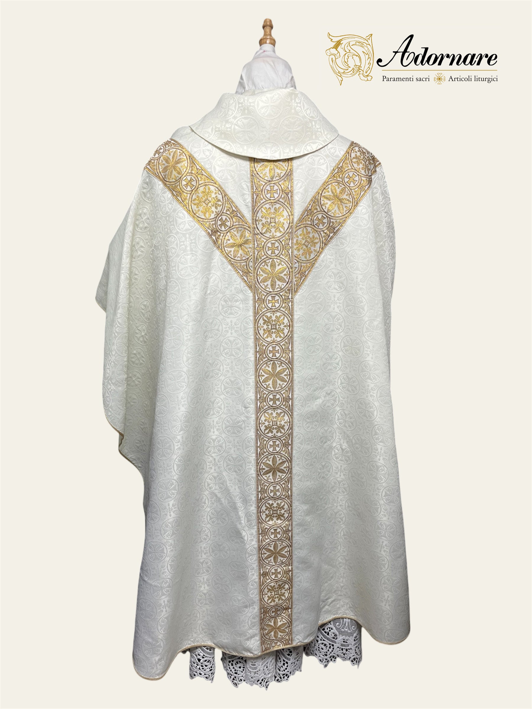 The gothic chasuble is made of lightweight polyester damask with a greek cross roundel design (without lining) and decorated with Y-orphrey of woven design. It has a hooded collar and is bordered with gold trim. Supplied with a matching stole.