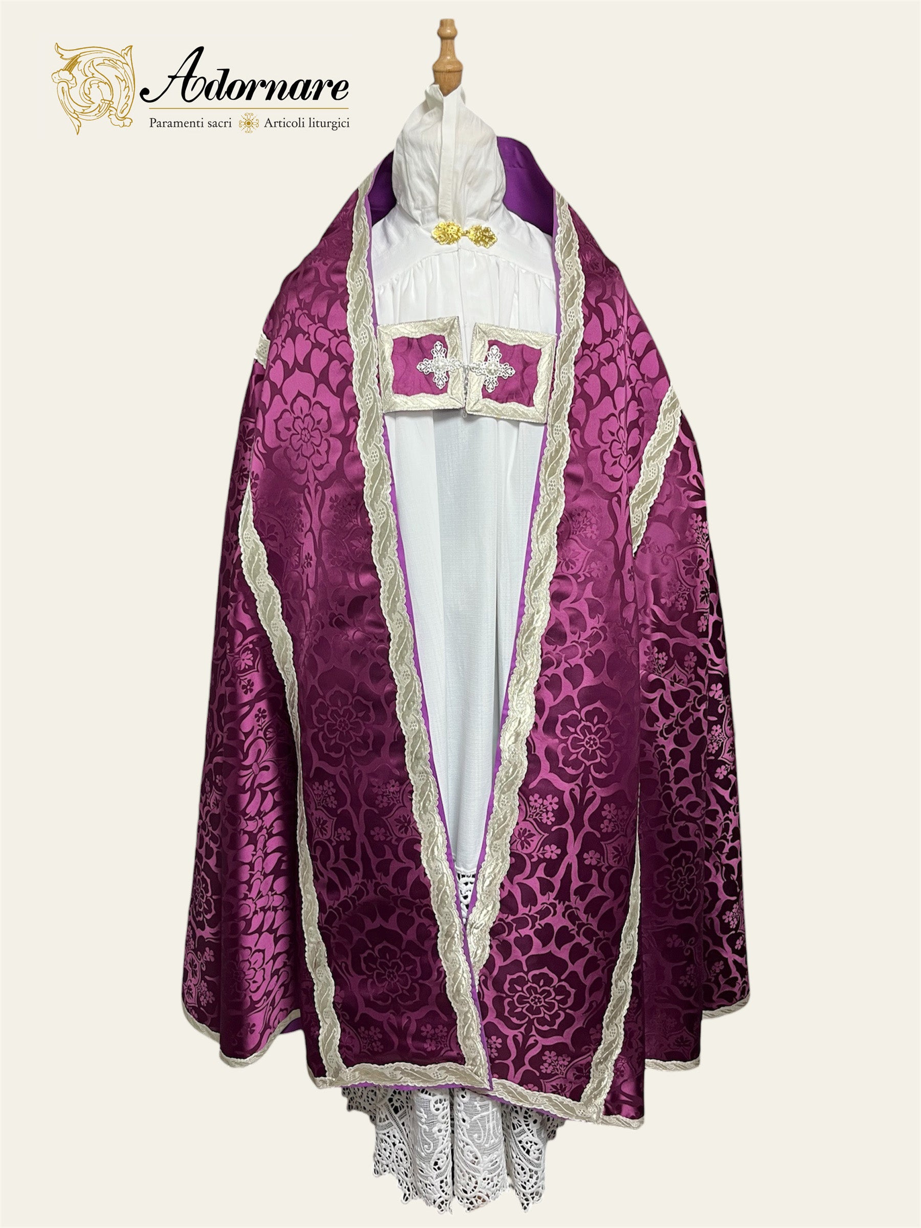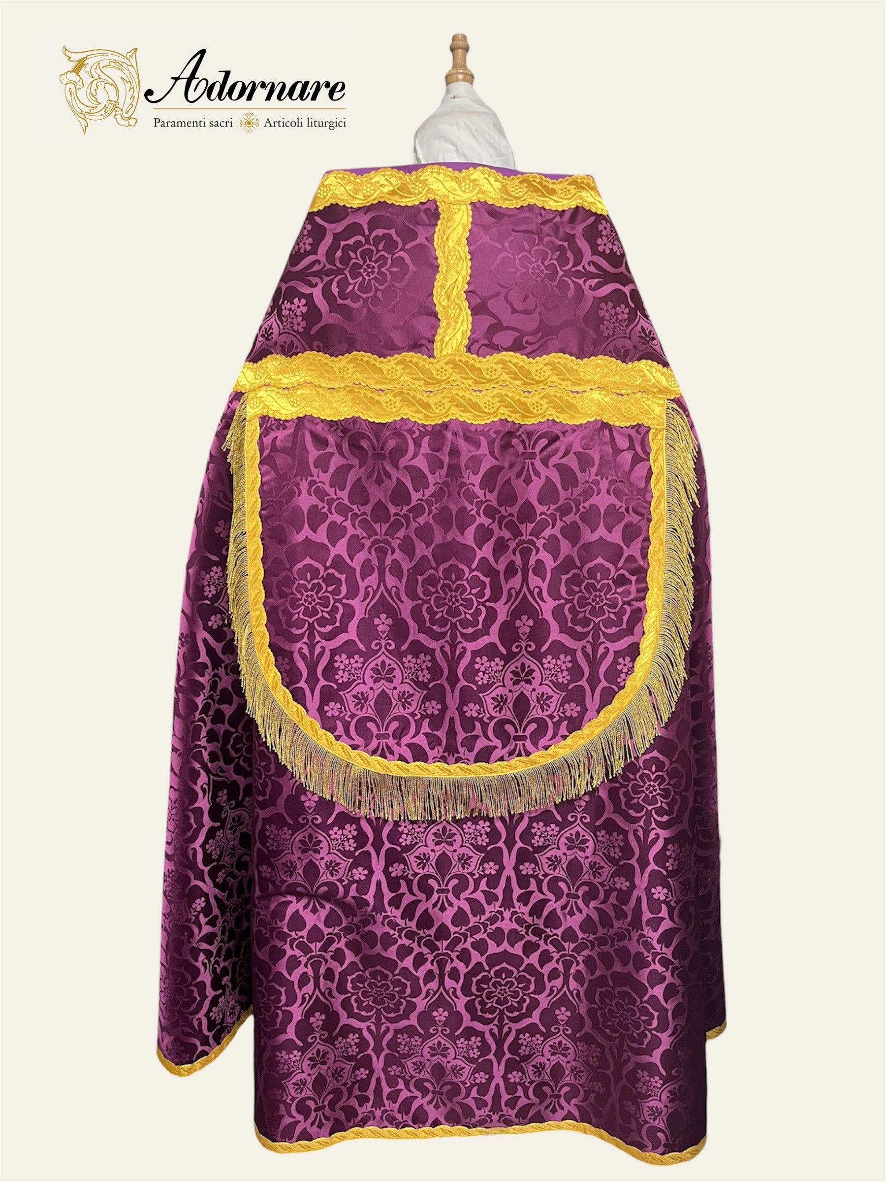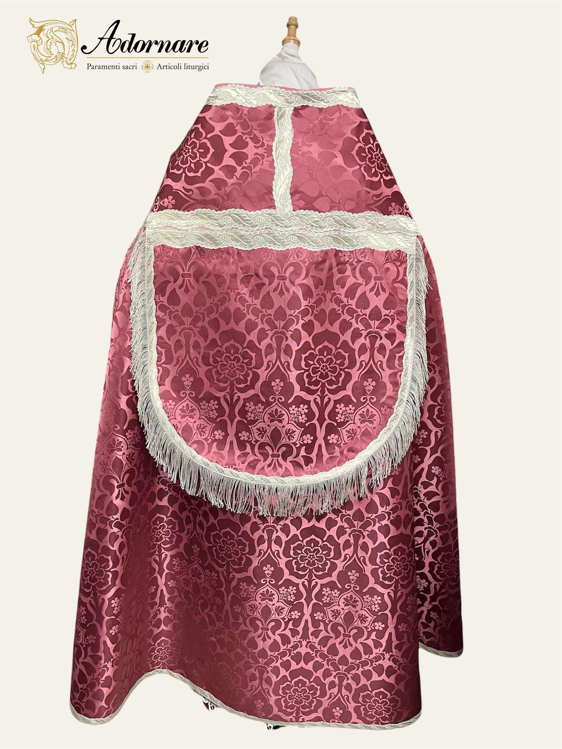 The Roman cope is made with Winchester brocade damask (100% viscose) in all liturgical colours. The cope shape is cut in the roman style, and the standard length is 140 cm from the back. Please let us know the required length when you order.