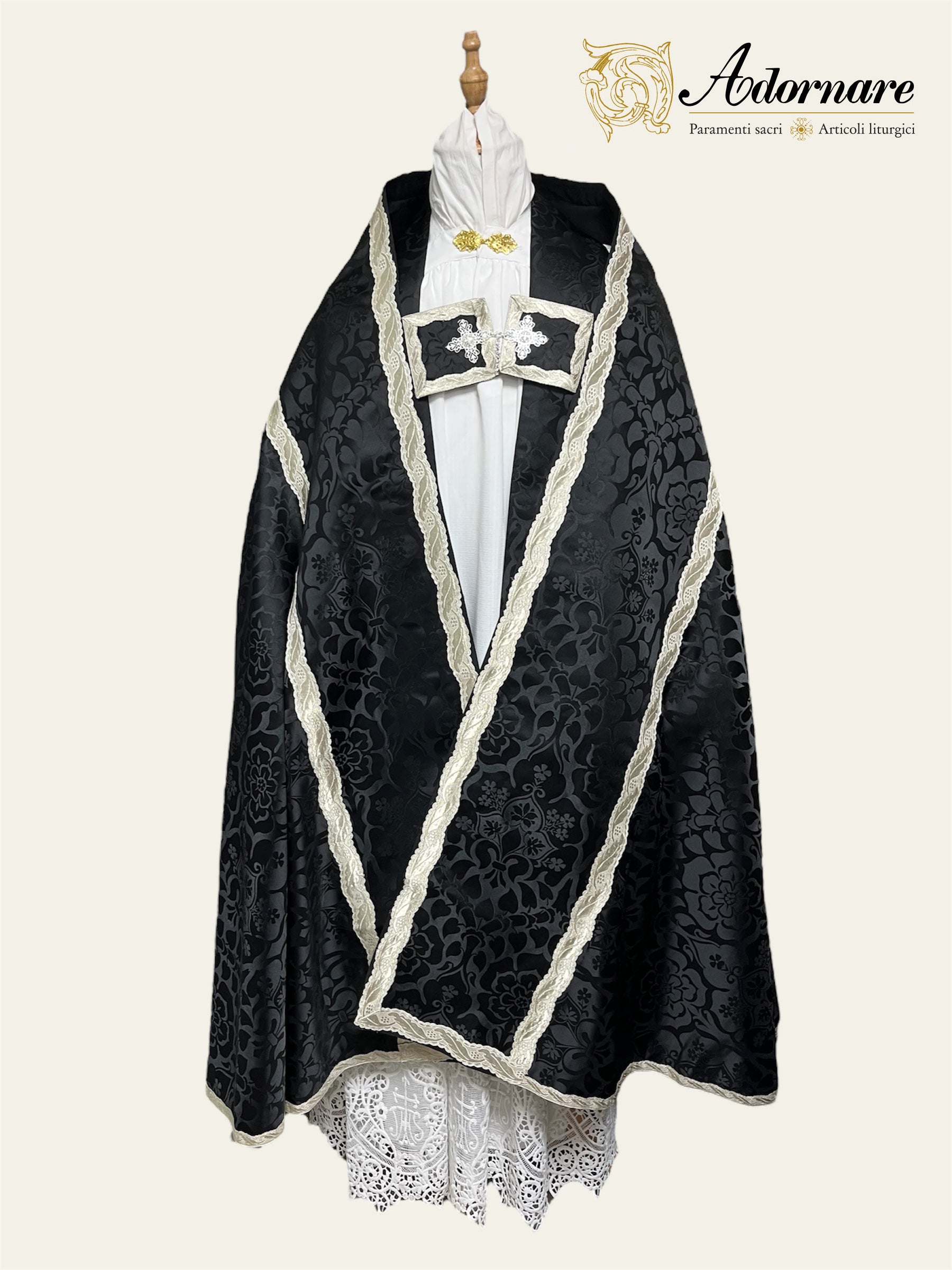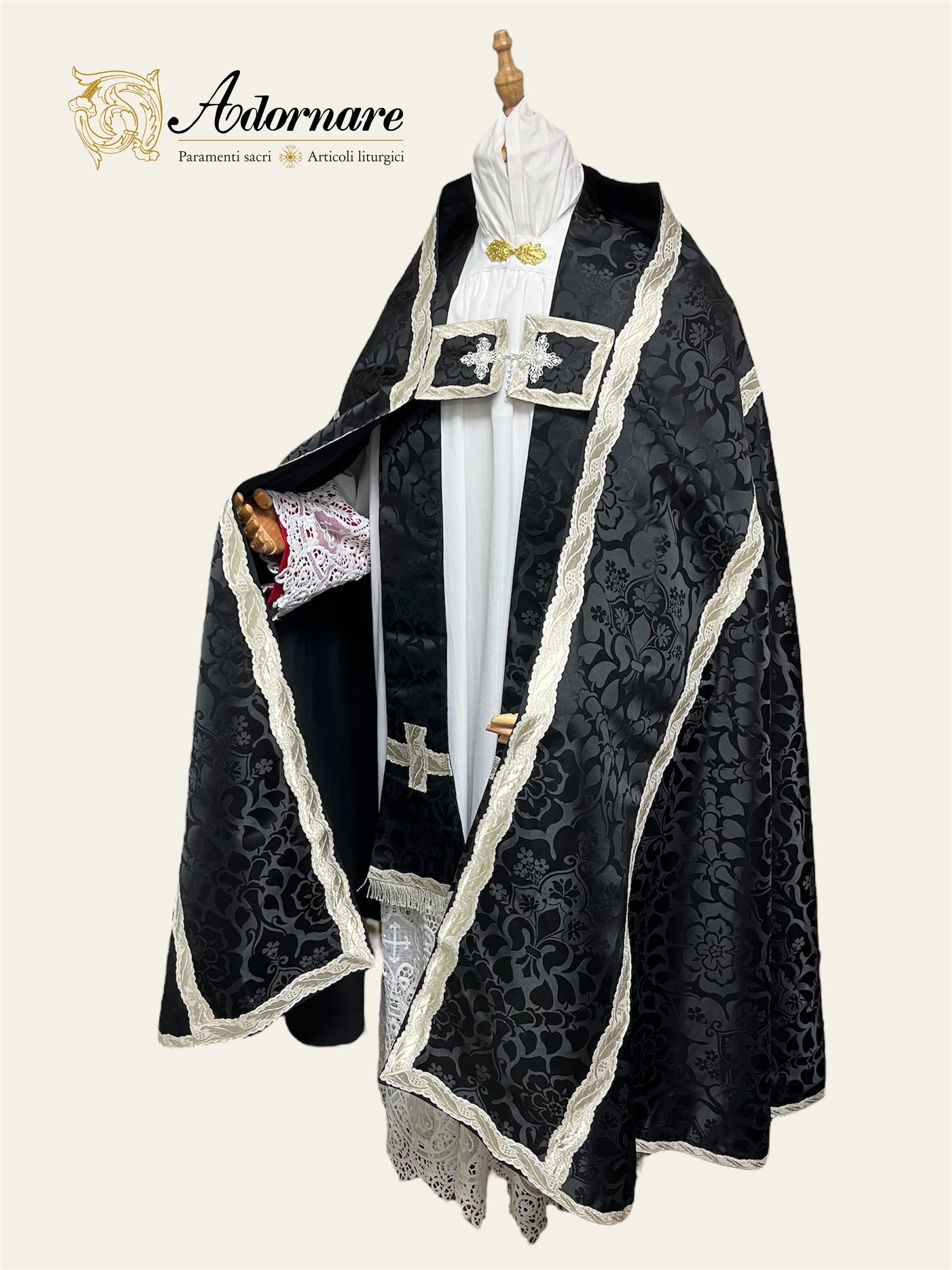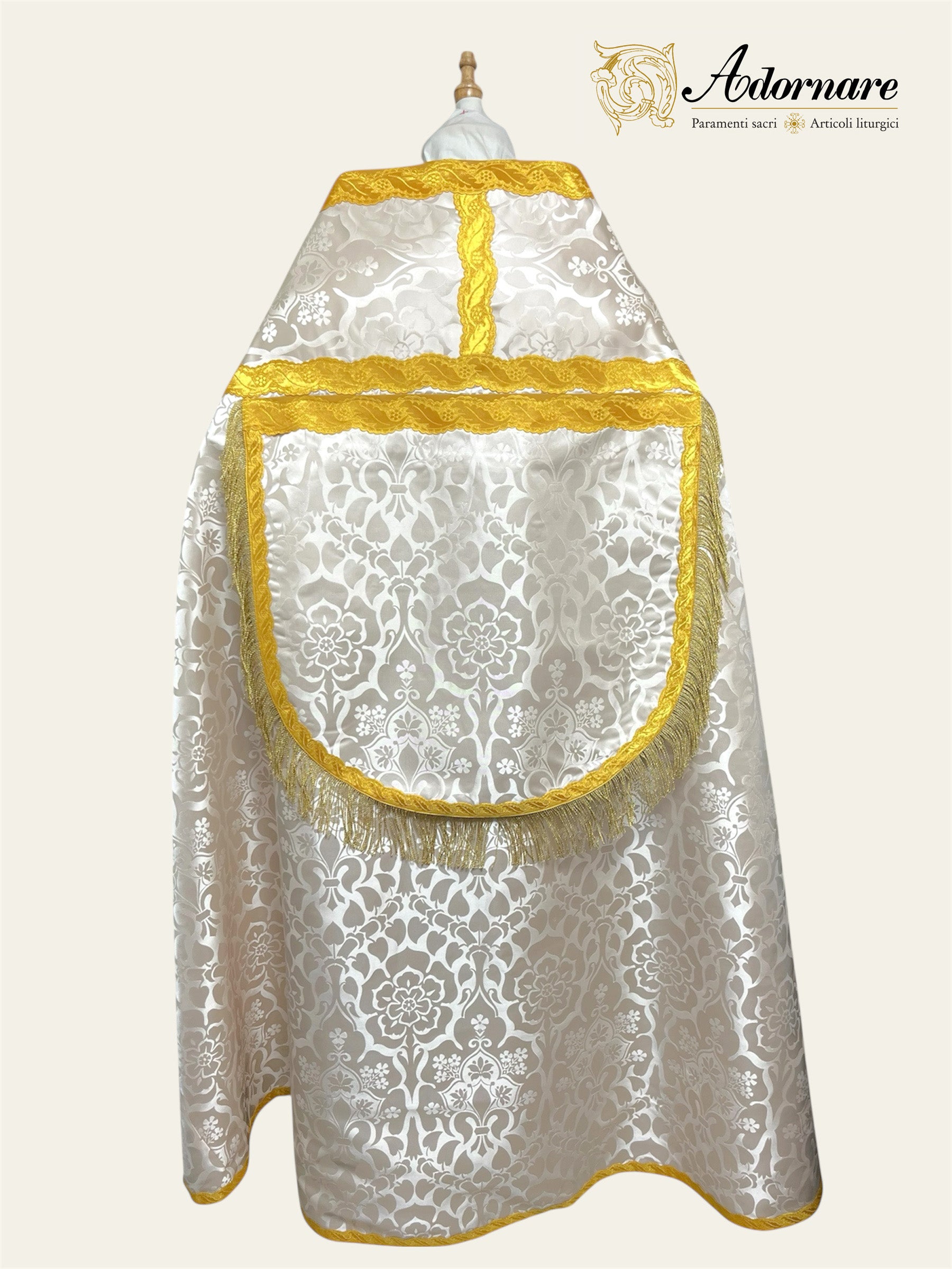The Roman cope is made with Winchester brocade damask (100% viscose) in all liturgical colours. The cope shape is cut in the roman style, and the standard length is 140 cm from the back. Please let us know the required length when you order.