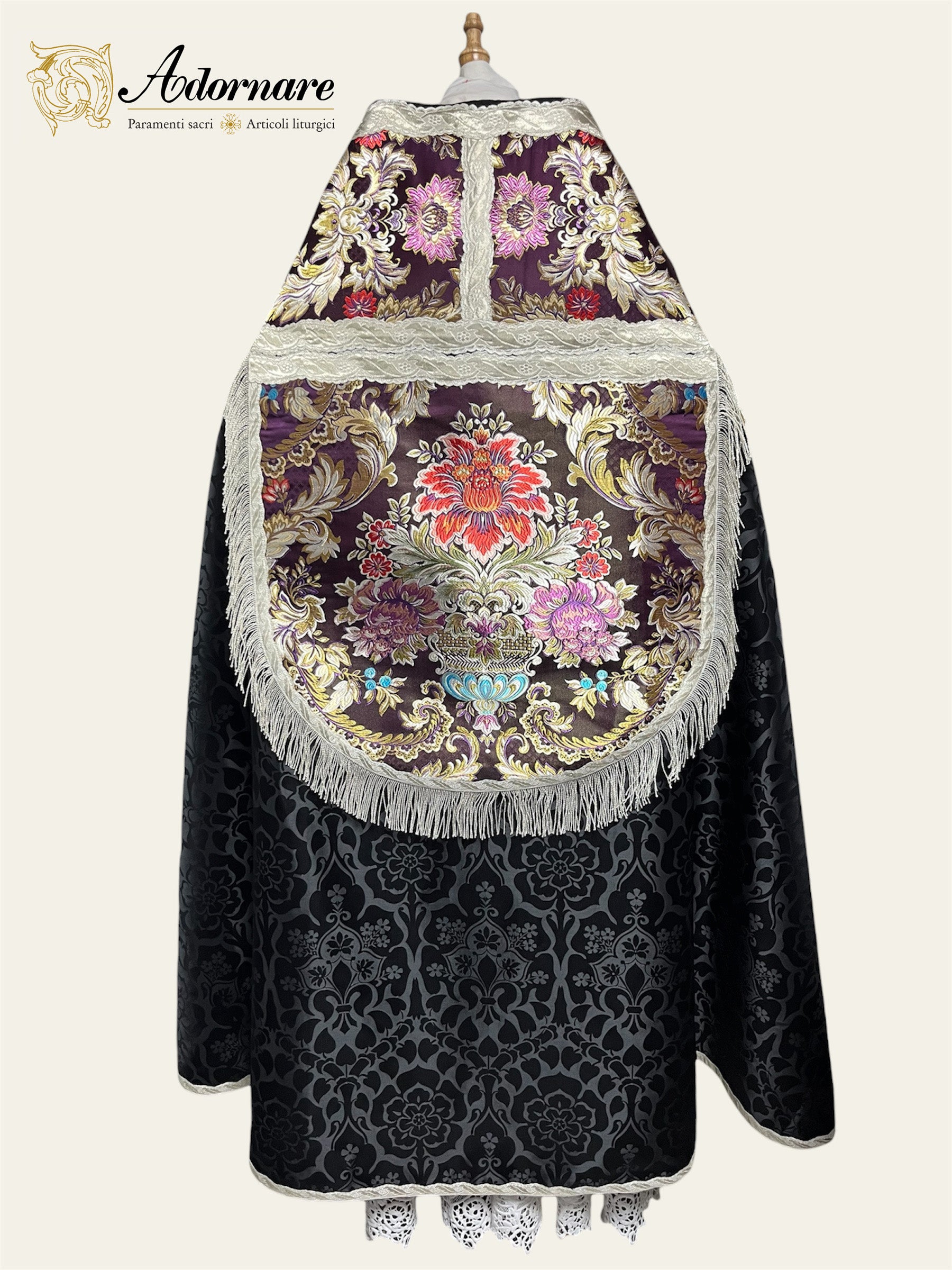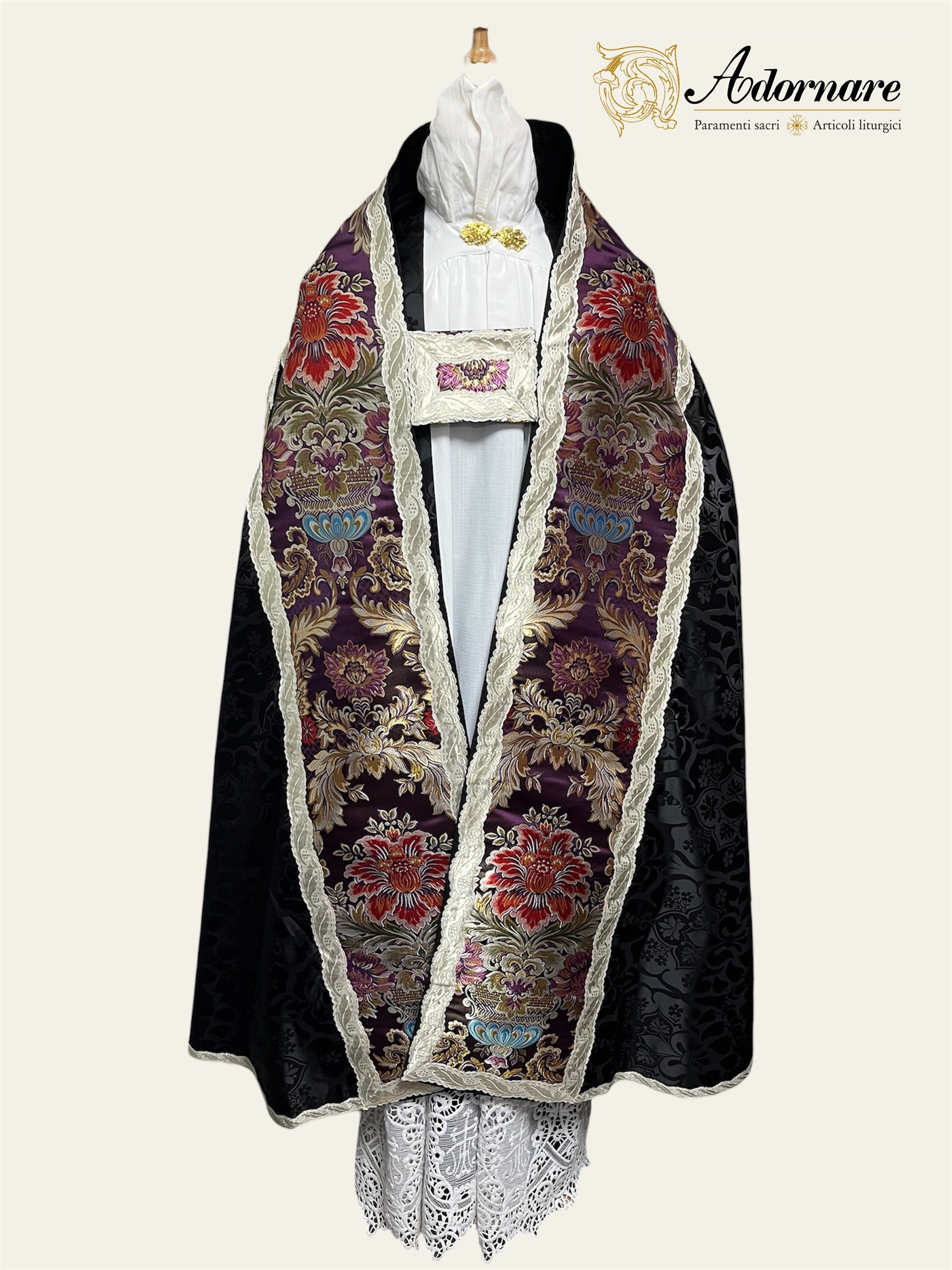 The Roman cope is made with Winchester brocade damask (100% viscose) with its panels and hood in Italian Floral Brocade (75% viscose, 25% silk). Available in six liturgical colours (red, green, ivory, purple, Marian and black), or in a panel of contrasting colour. The cope can be decorated with gold or silver wavy gallons. The cope shape is cut in the roman style, and the standard length is 140 cm from the back. Please let us know the required length when you order.