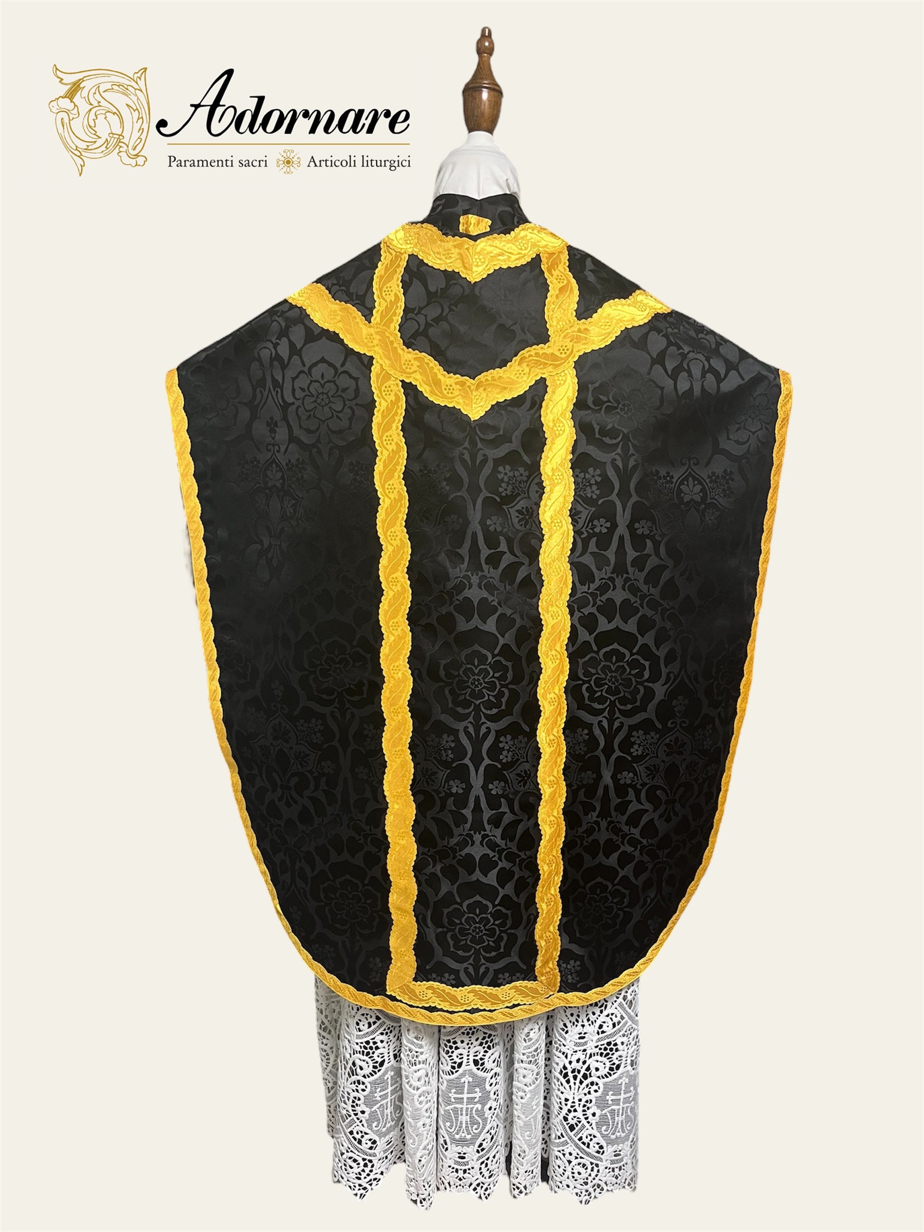 The Philip Neri Chasuble is made in Winchester brocade (100% viscose). Decorated with standard gold wavy gallons and high quality metallic rayon fringes.