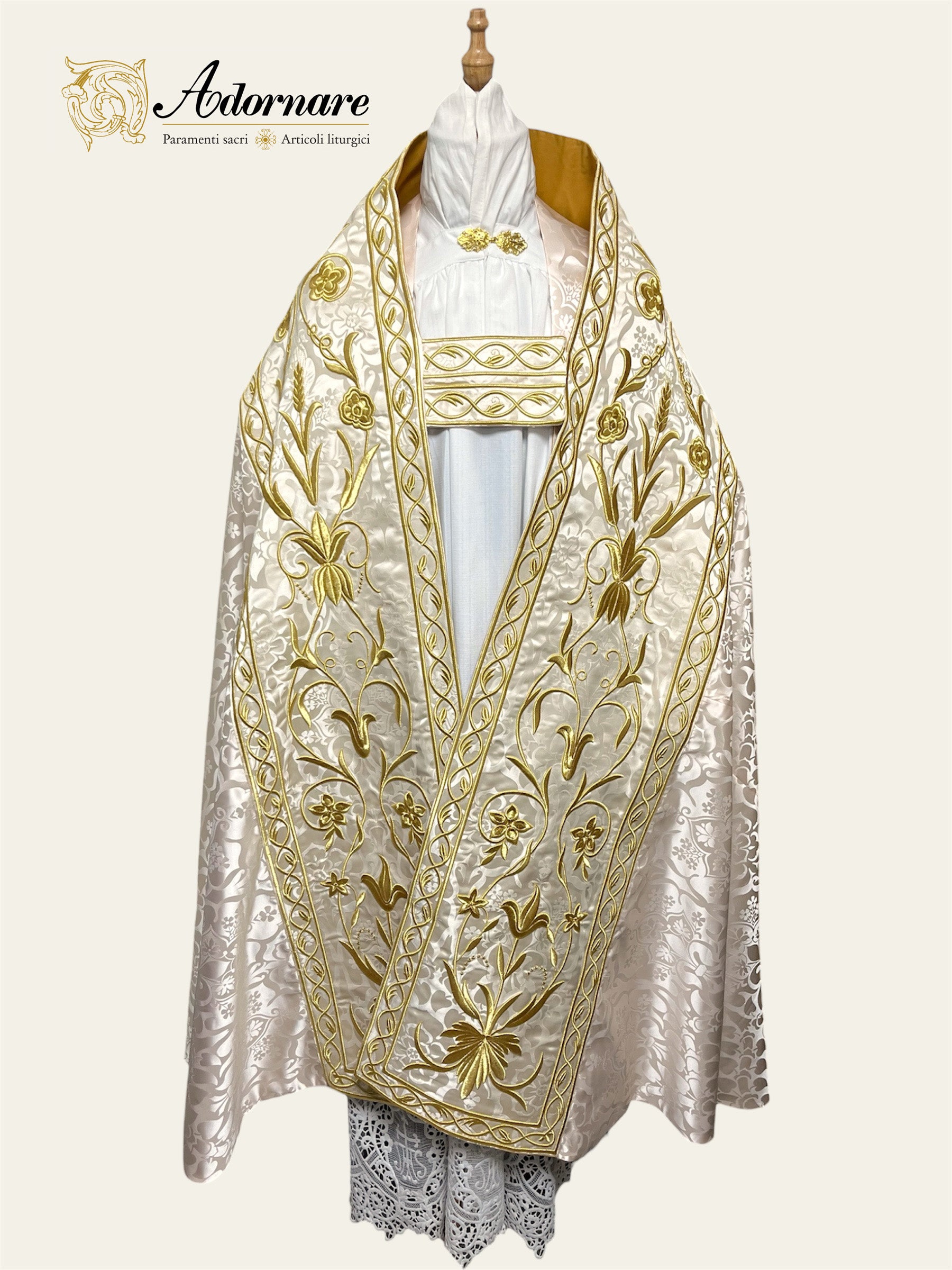 There is also the option to add a matching damask humeral veil with sunburst IHS embroidery (except for Black) and a matching embroidered damask roman cope with rich floral motifs.