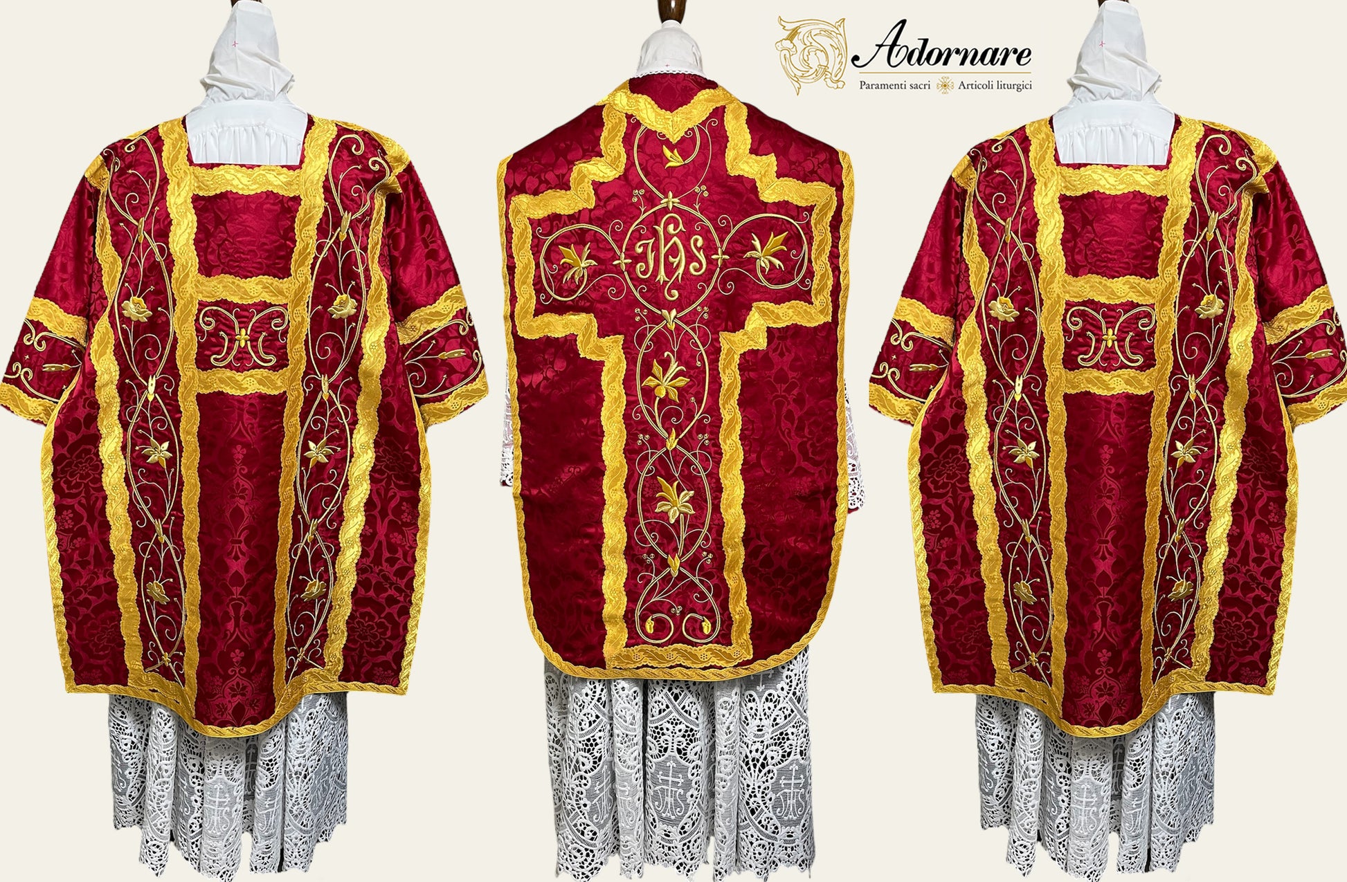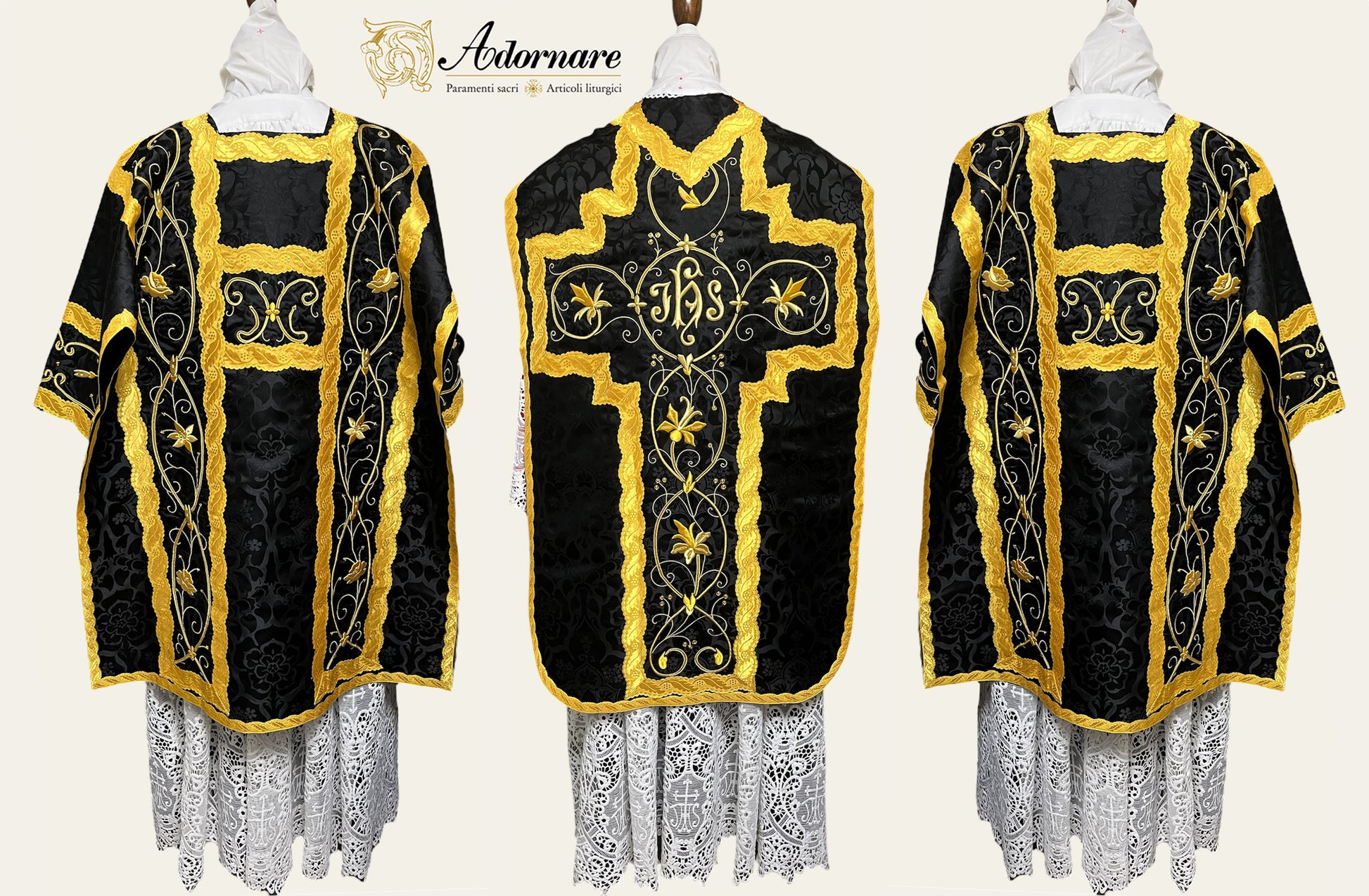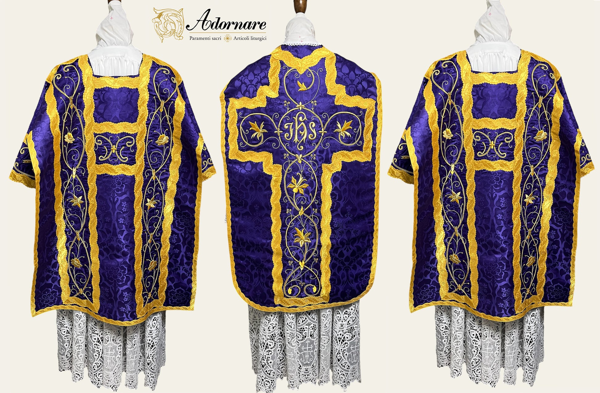 There is also the option to add a matching damask humeral veil with sunburst IHS embroidery (except for Black) and a damask cope made in the French shape with an Agnus Dei appliqué with sunburst rays made by hand.