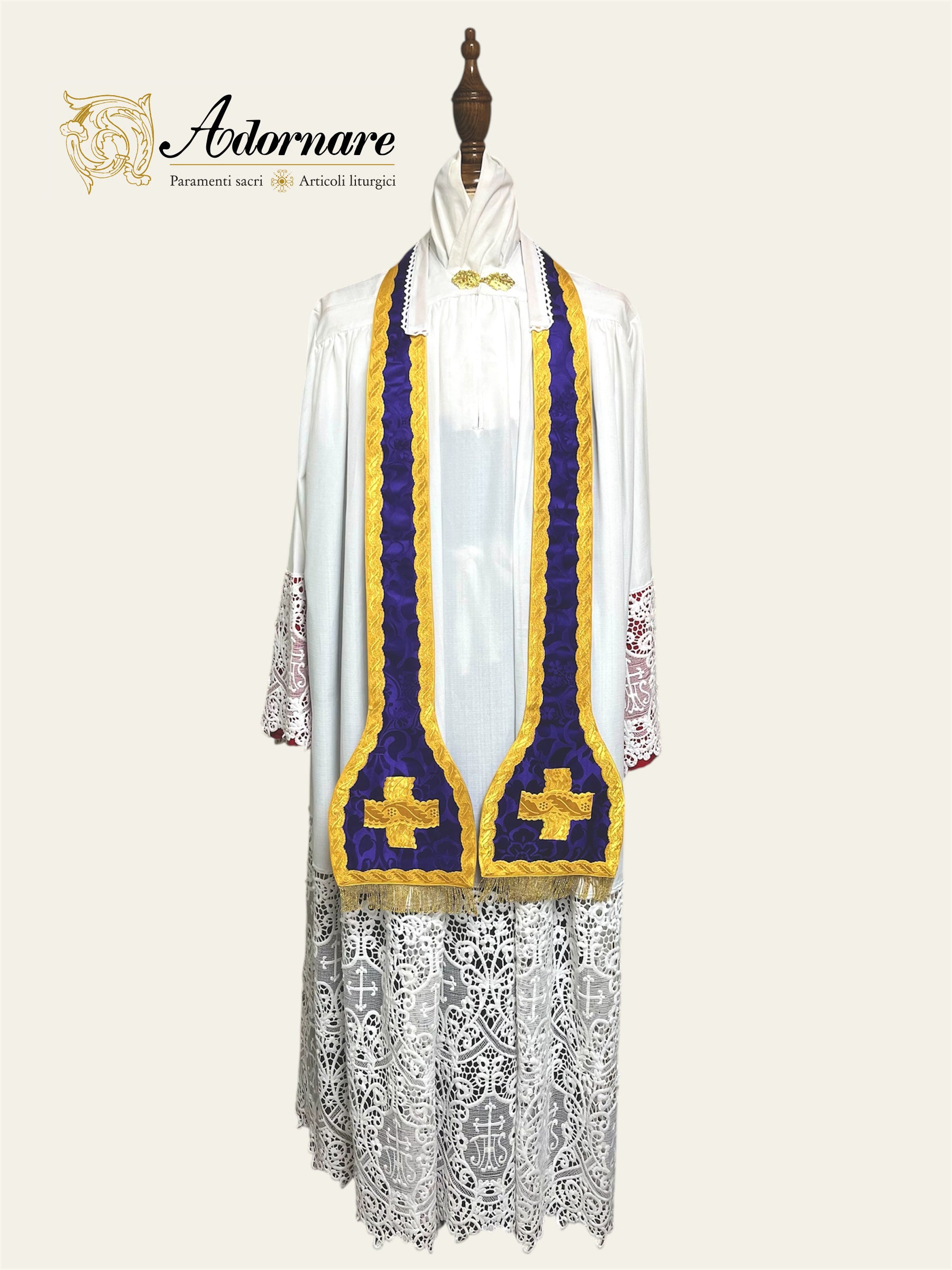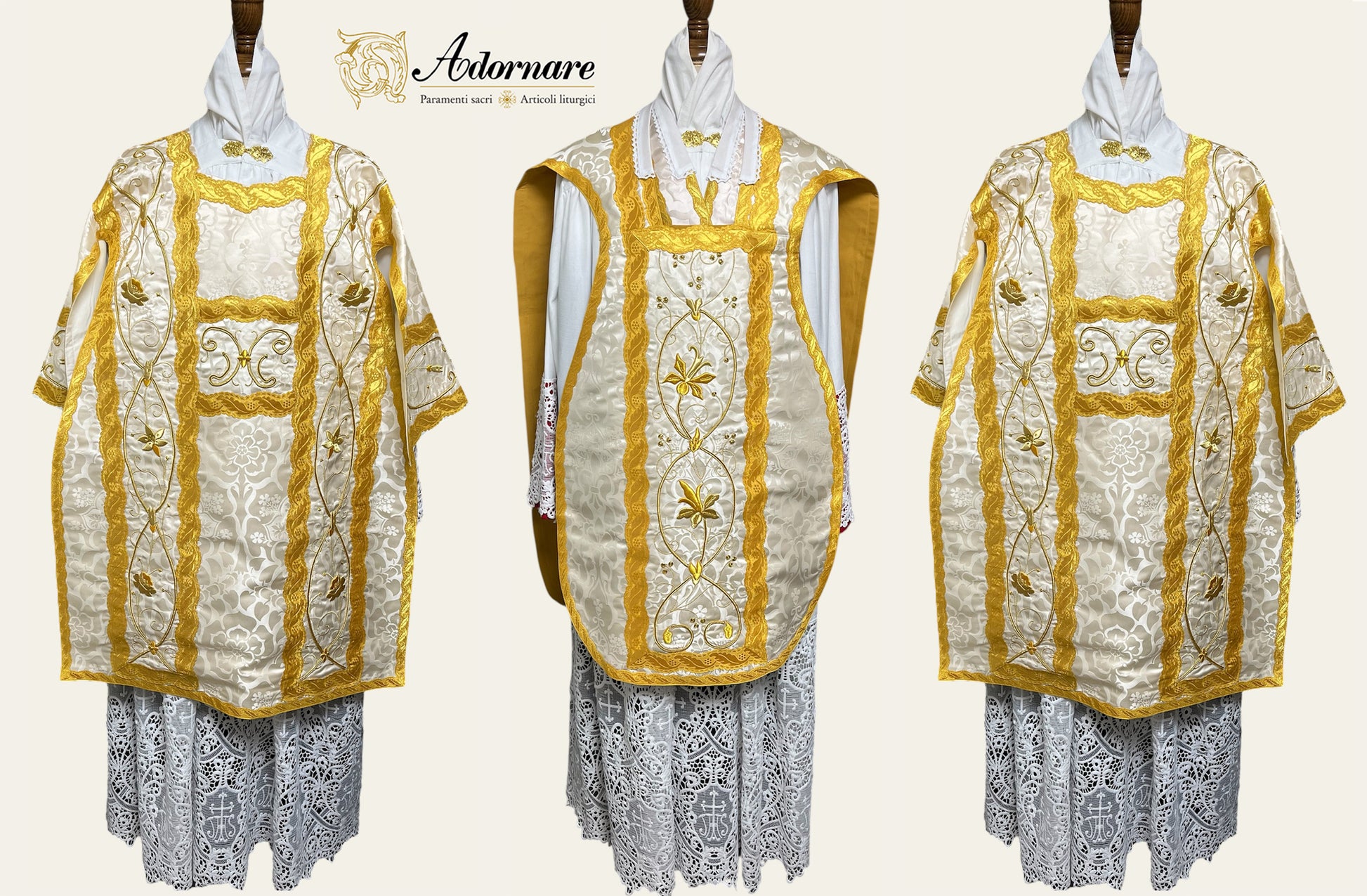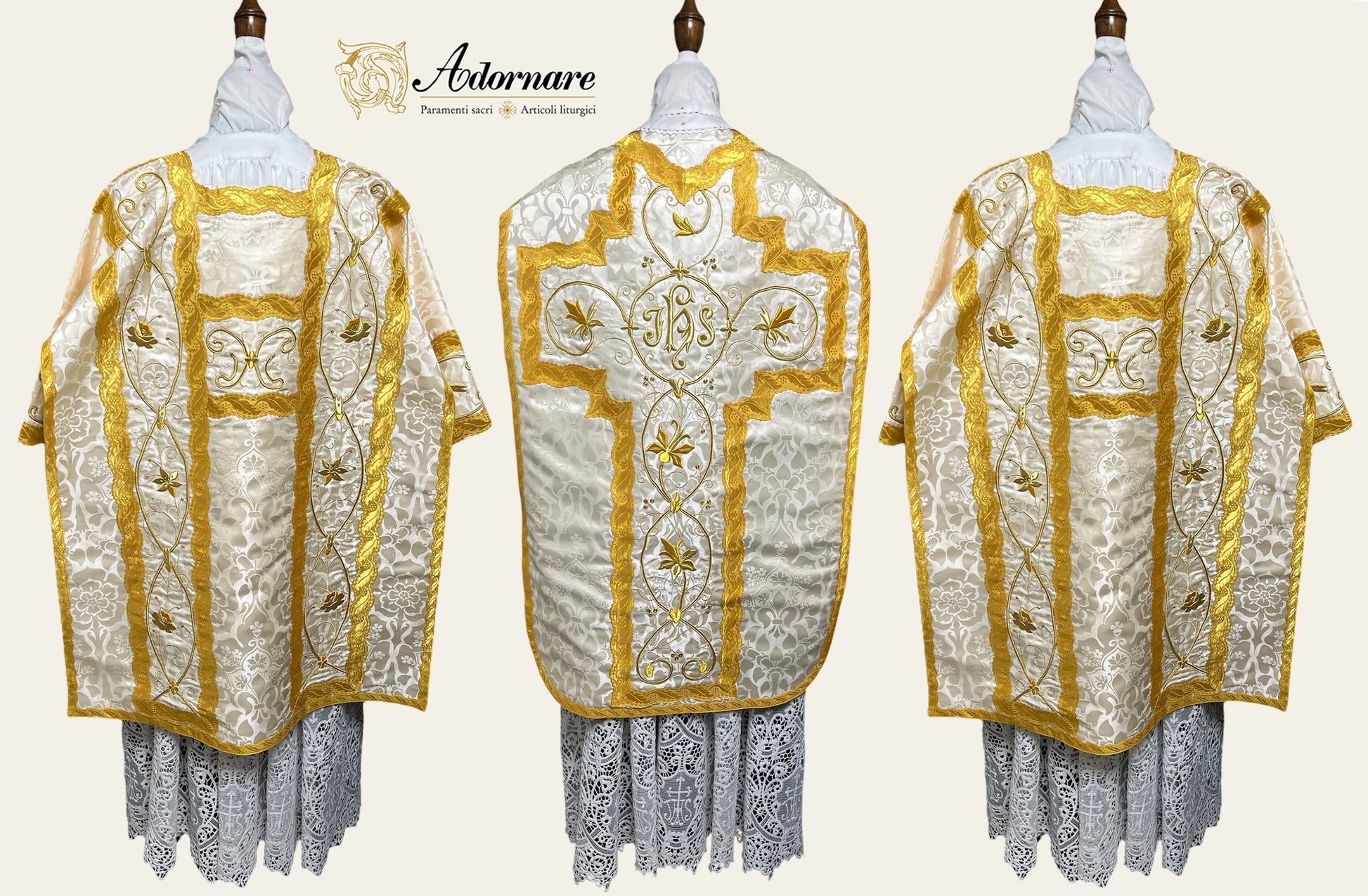 There is also the option to add a matching damask humeral veil with sunburst IHS embroidery (except for Black) and a damask cope made in the French shape with an Agnus Dei appliqué with sunburst rays made by hand.