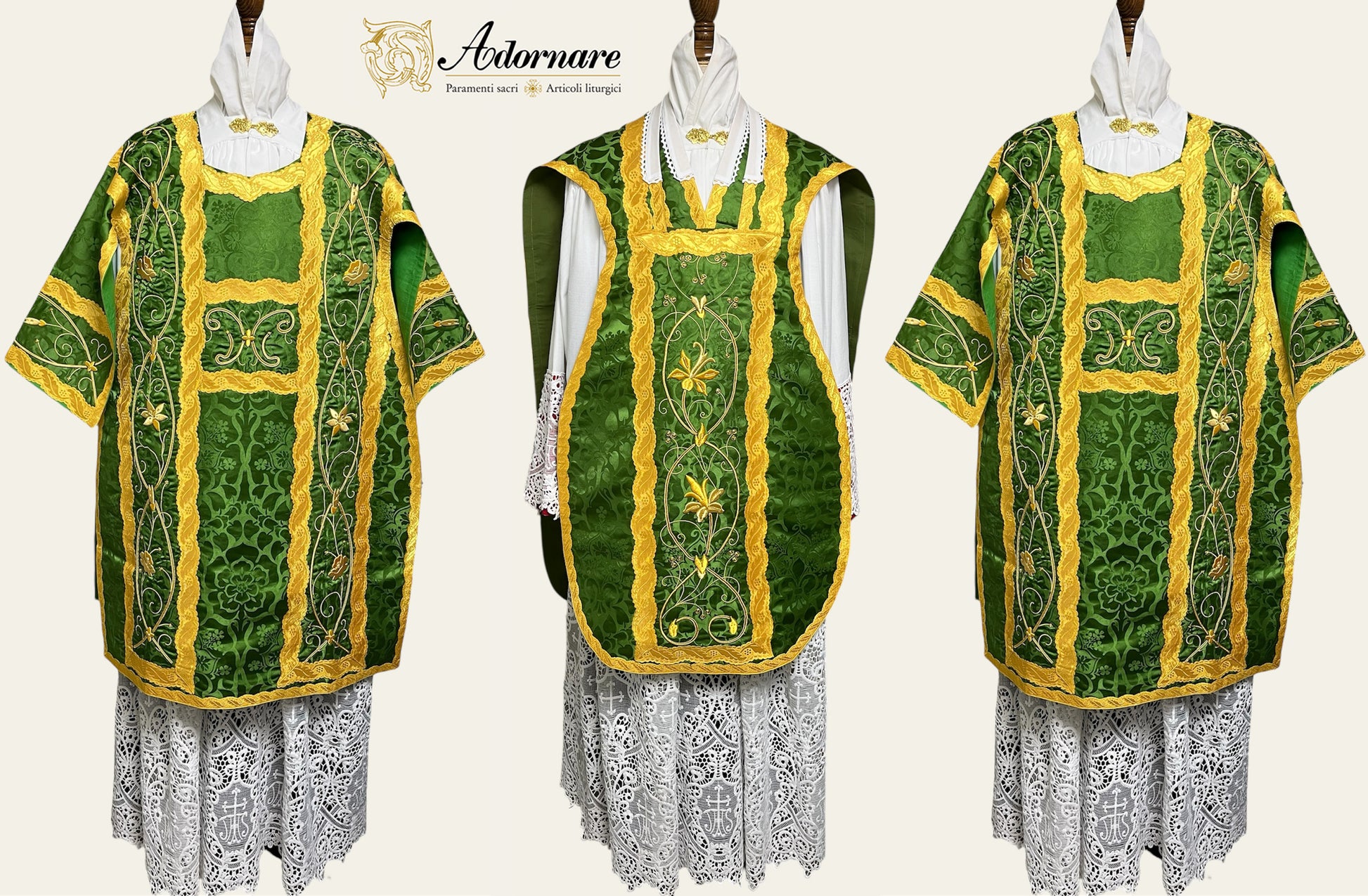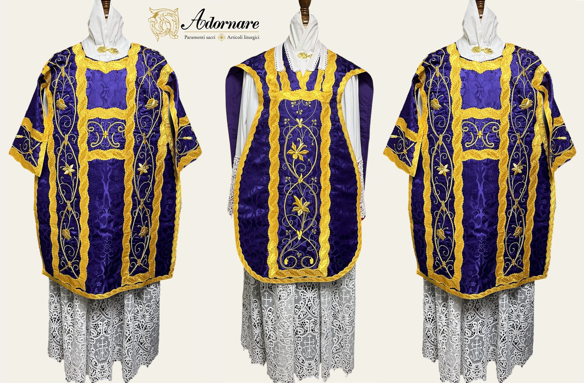 This Solemn Mass Set is in the French style and made in damask fabric (Winchester brocade). Exquisite hand and machine embroideries in traditional French floral motifs decorate the chasuble, dalmatic and tunicle, the details include metal bullion yarns, cords and metallic shapes. The complex embroideries on each vestment take many days of work to produce by our skilled embroiderers.
