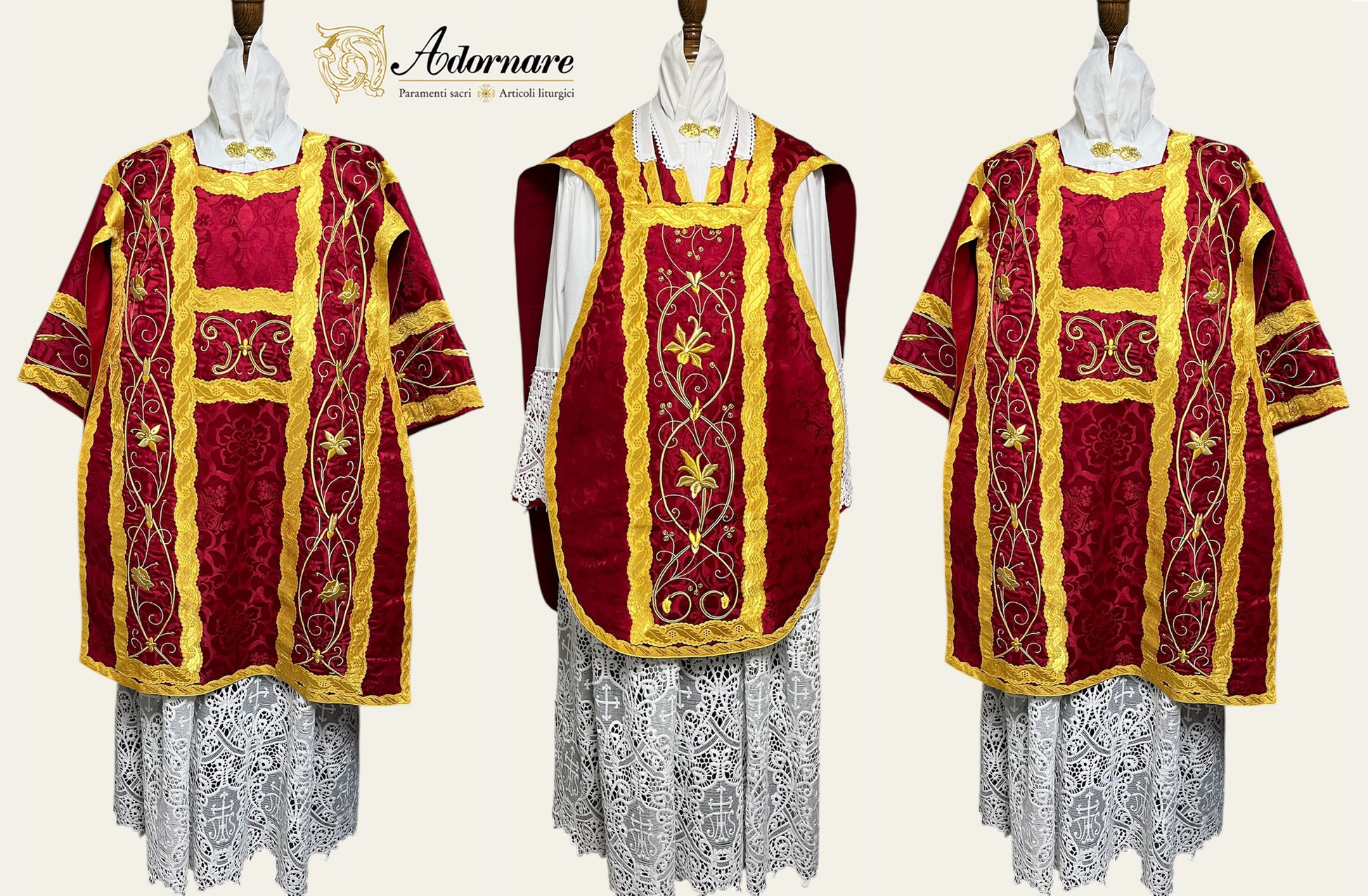 The basic Solemn Mass Set includes: a chasuble, a dalmatic and a tunicle (same design), one priest's stole, one deacon's stole, three maniples, a chalice veil and a burse.