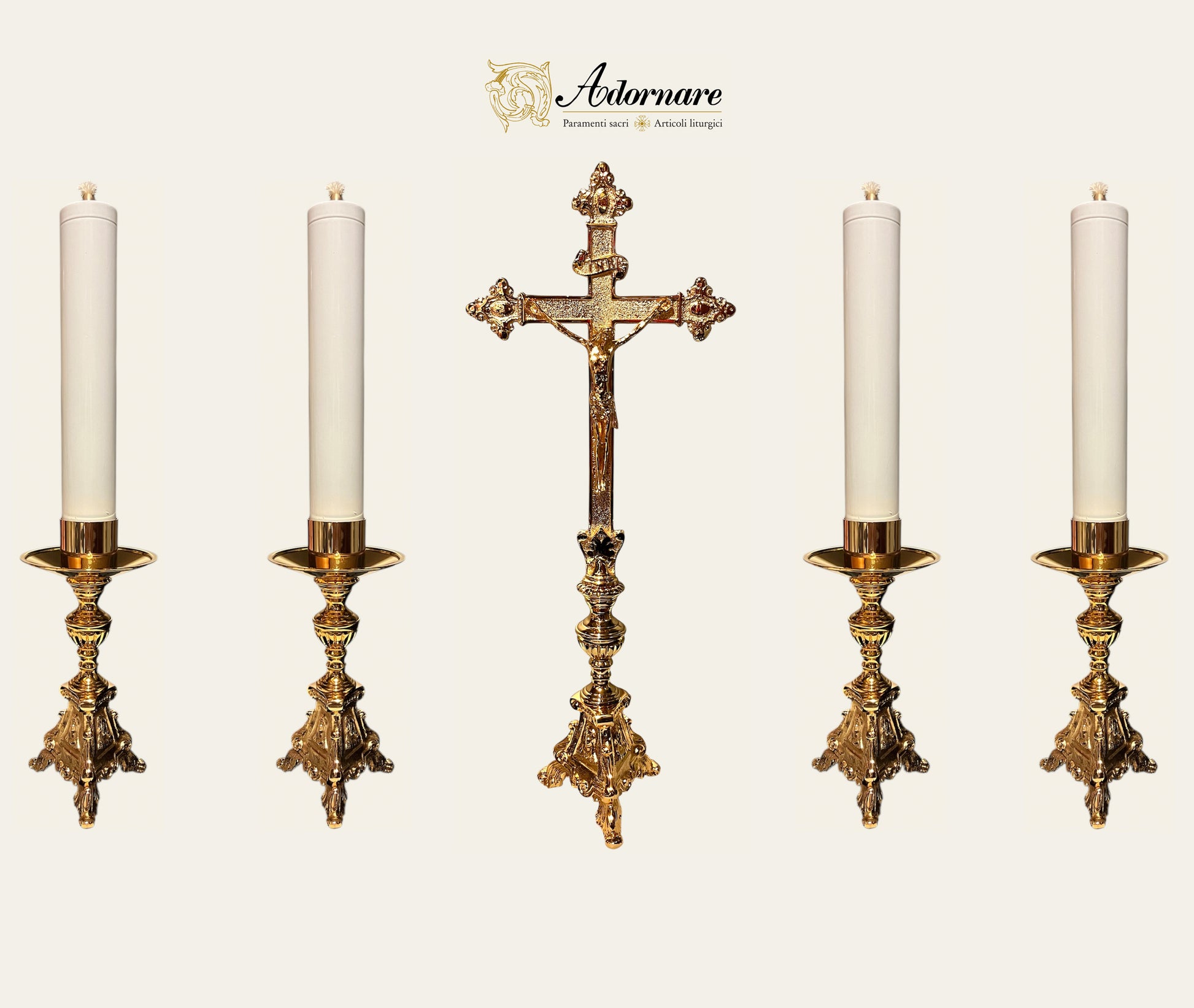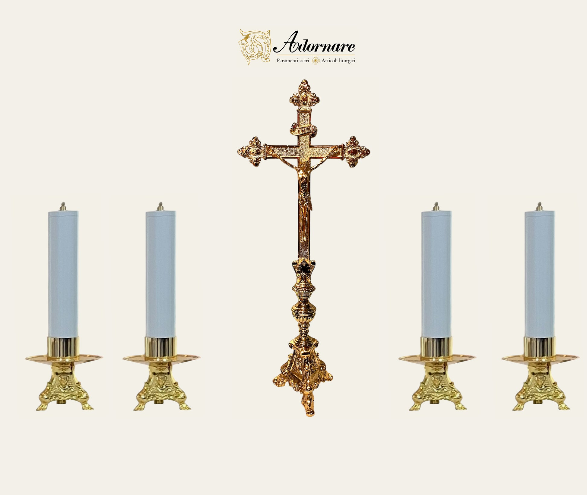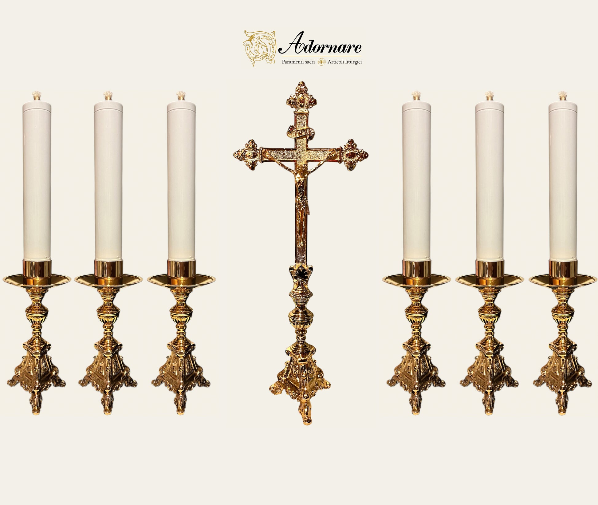 The crucifix and candlesticks are made of highly polished gold-plated brass.