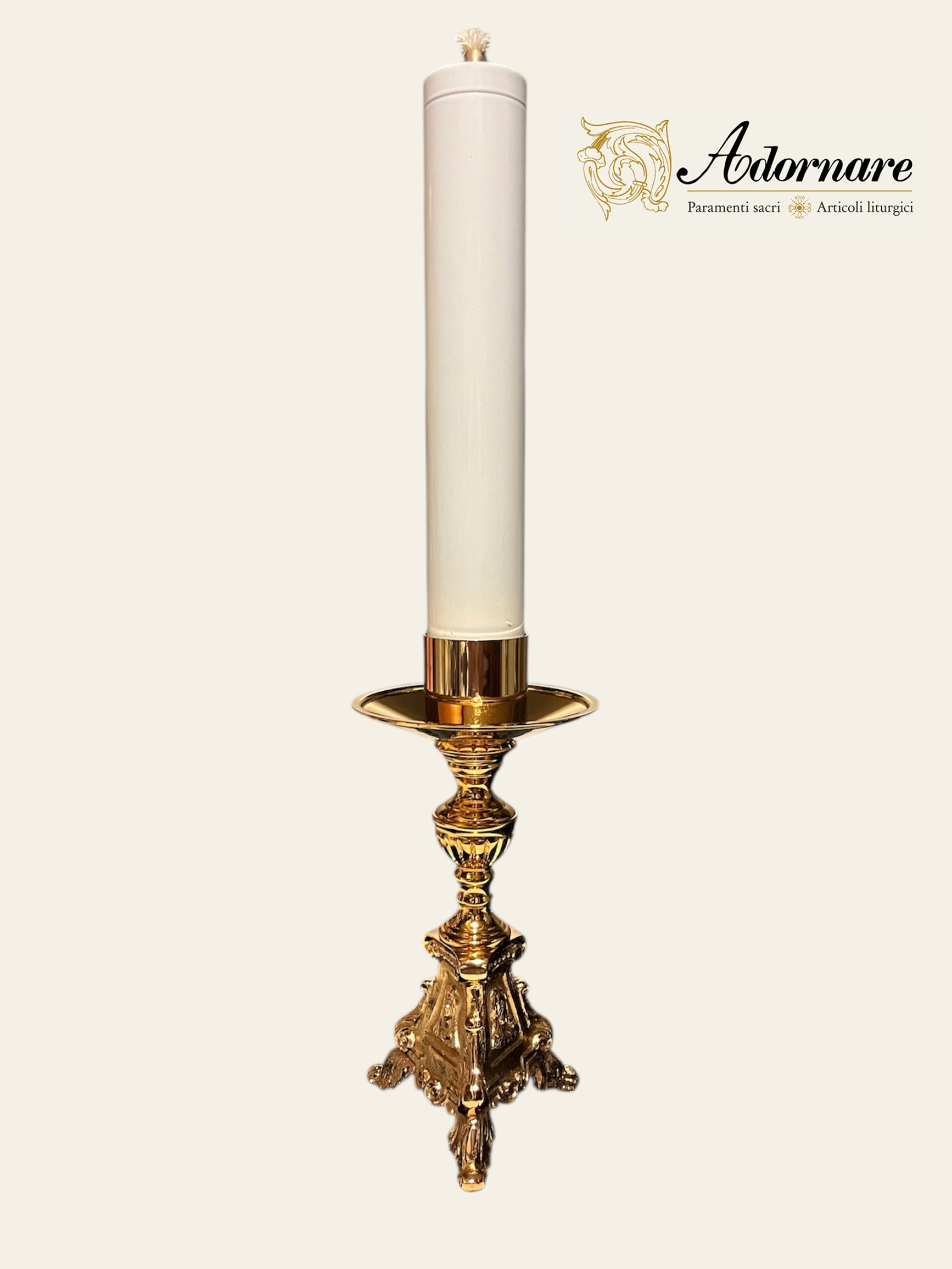 The candlesticks are fitted with a faux oil candle tubes, made of paint-coated zinc alloy and a brass nozzle for the wick. It screws open at the top to fill with oil, we recommend to burn paraffin oil designated for use with oil lamps. There are two types of candlesticks: a taller version and a shorter version. They can be ordered in pairs (2, 4, 6) or as a set of seven for pontifical masses.