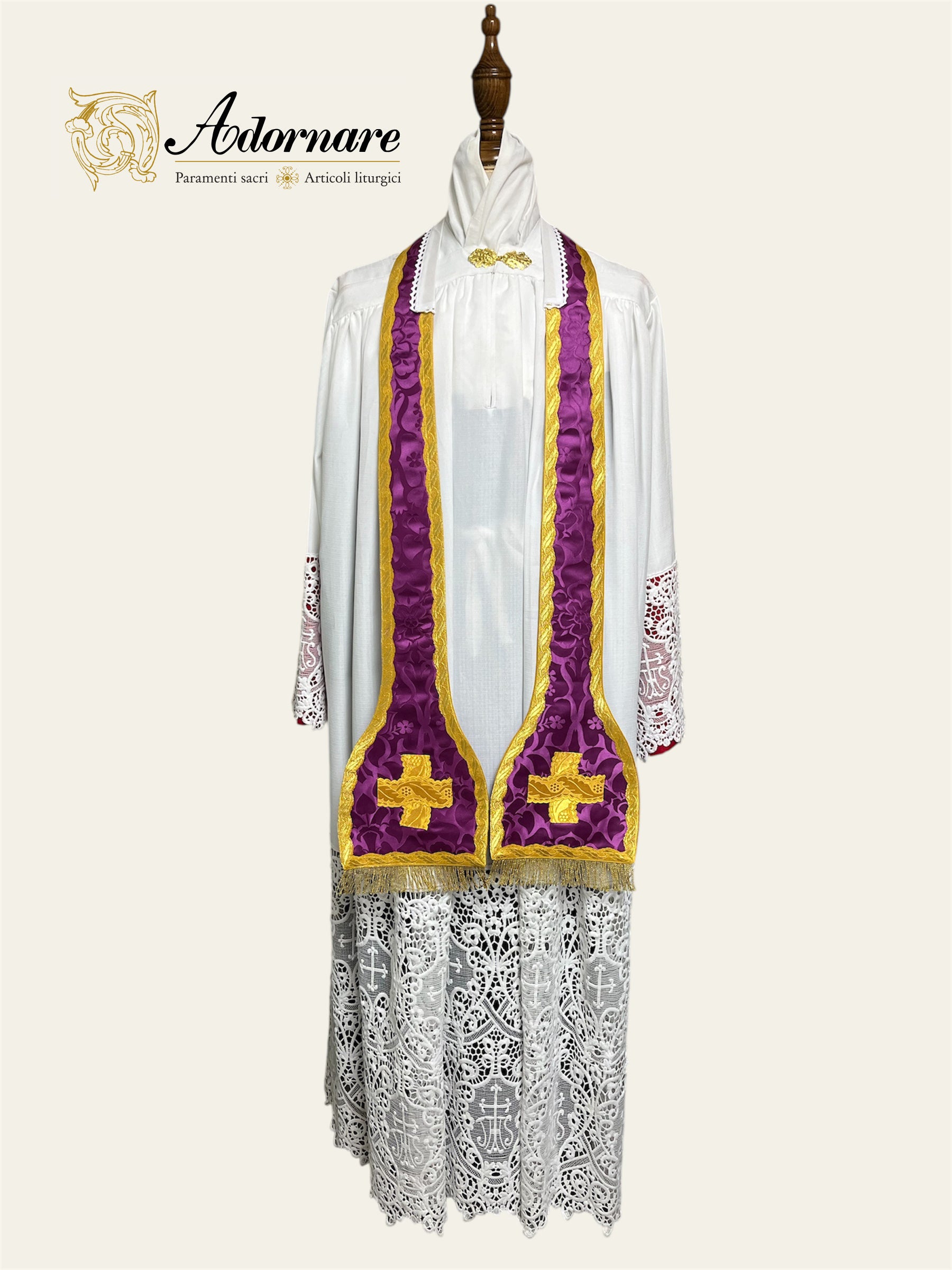 The set is made of Winchester Brocade (100% viscose), interlined and lined in cotton. The Low Mass Set is complete with a French Roman stole, French maniple, chalice veil and burse. Decorated with standard gold wavy gallons and rayon metallic fringes.
