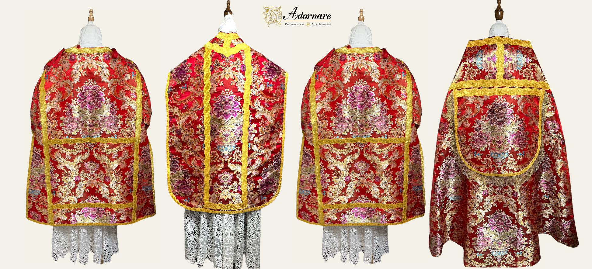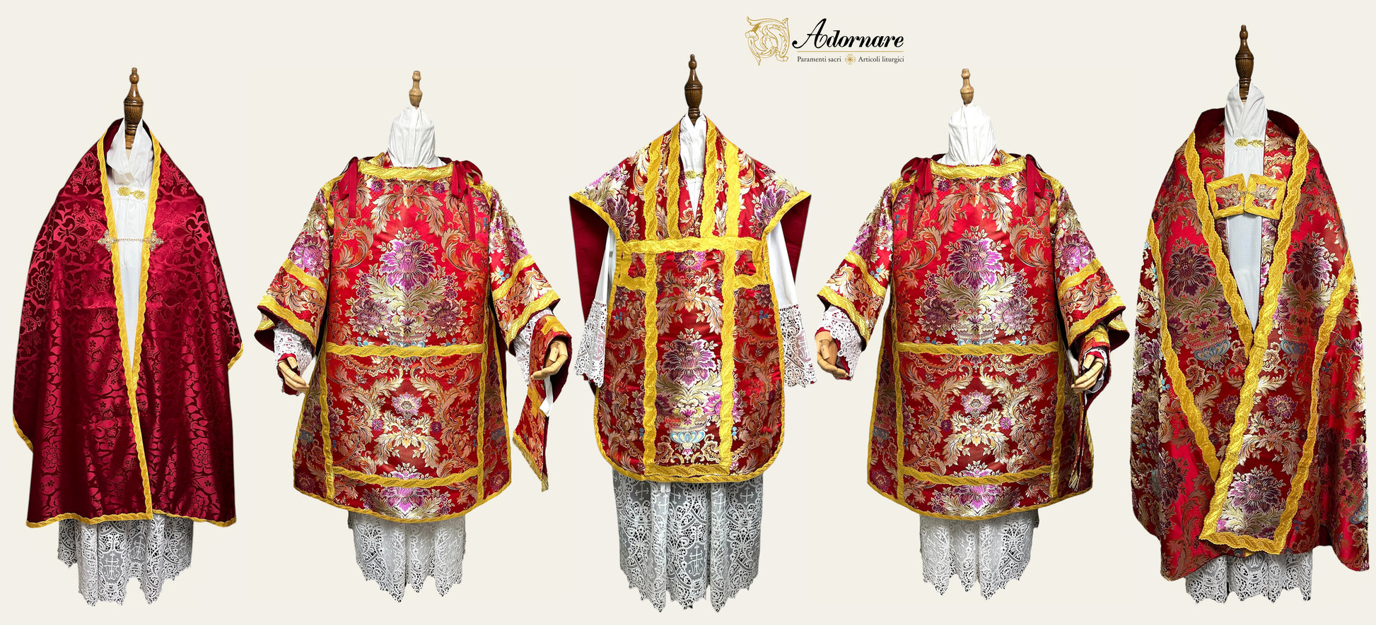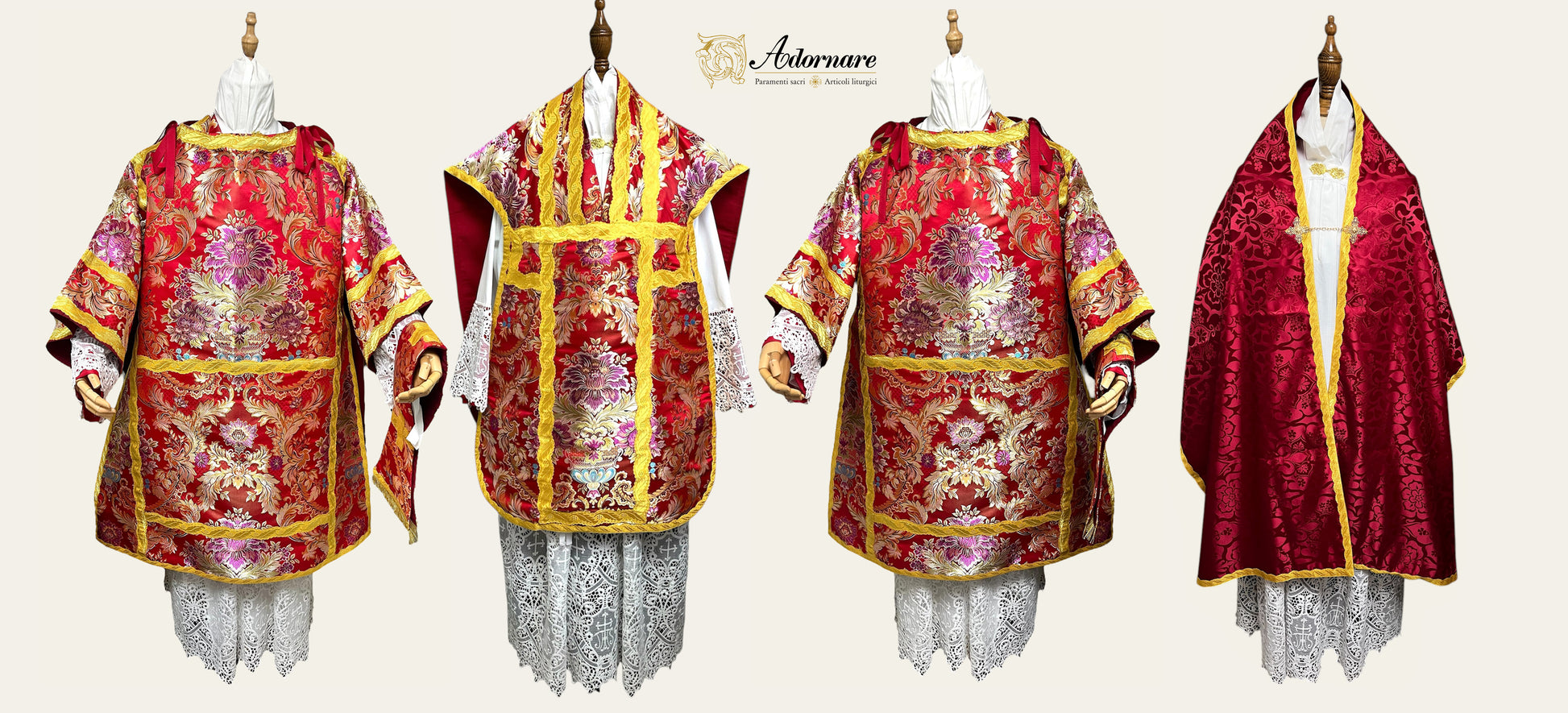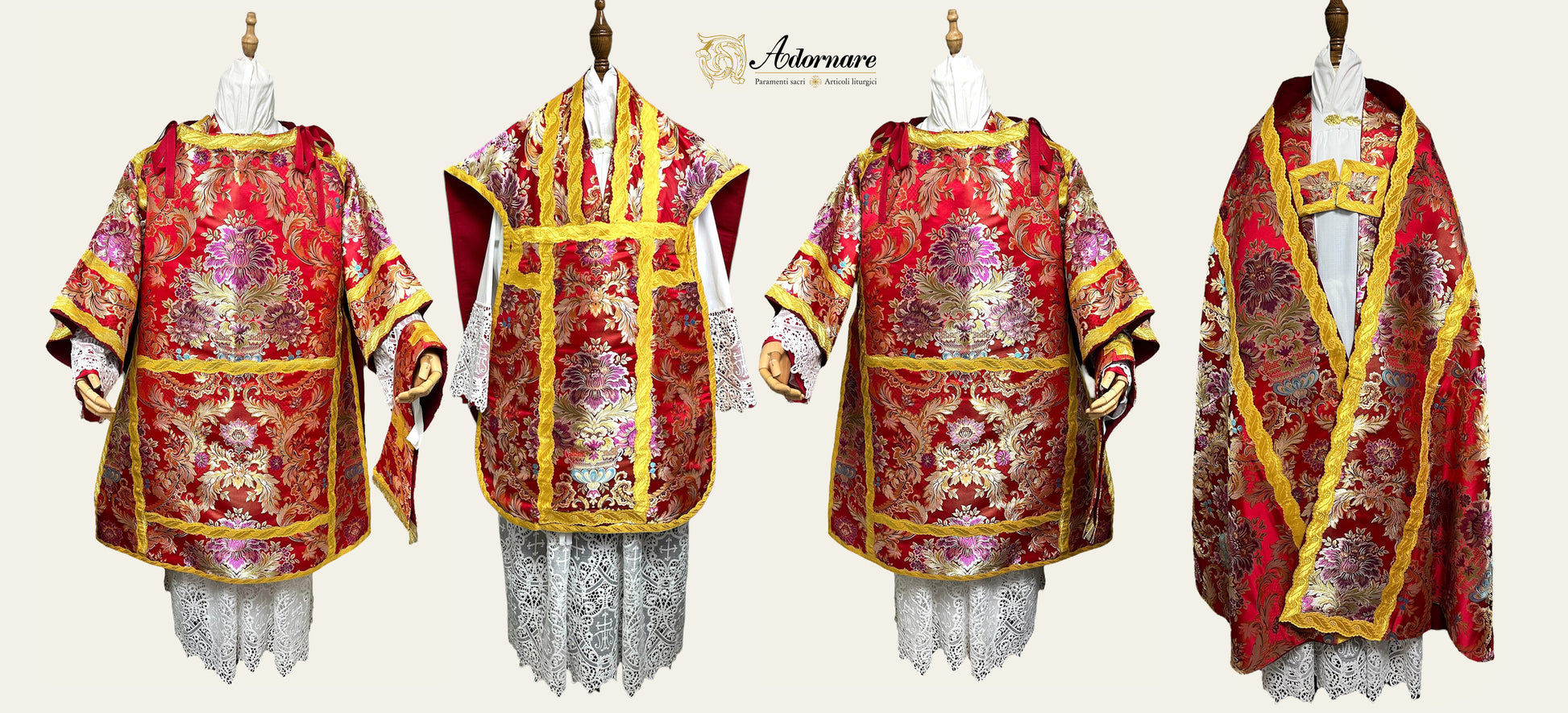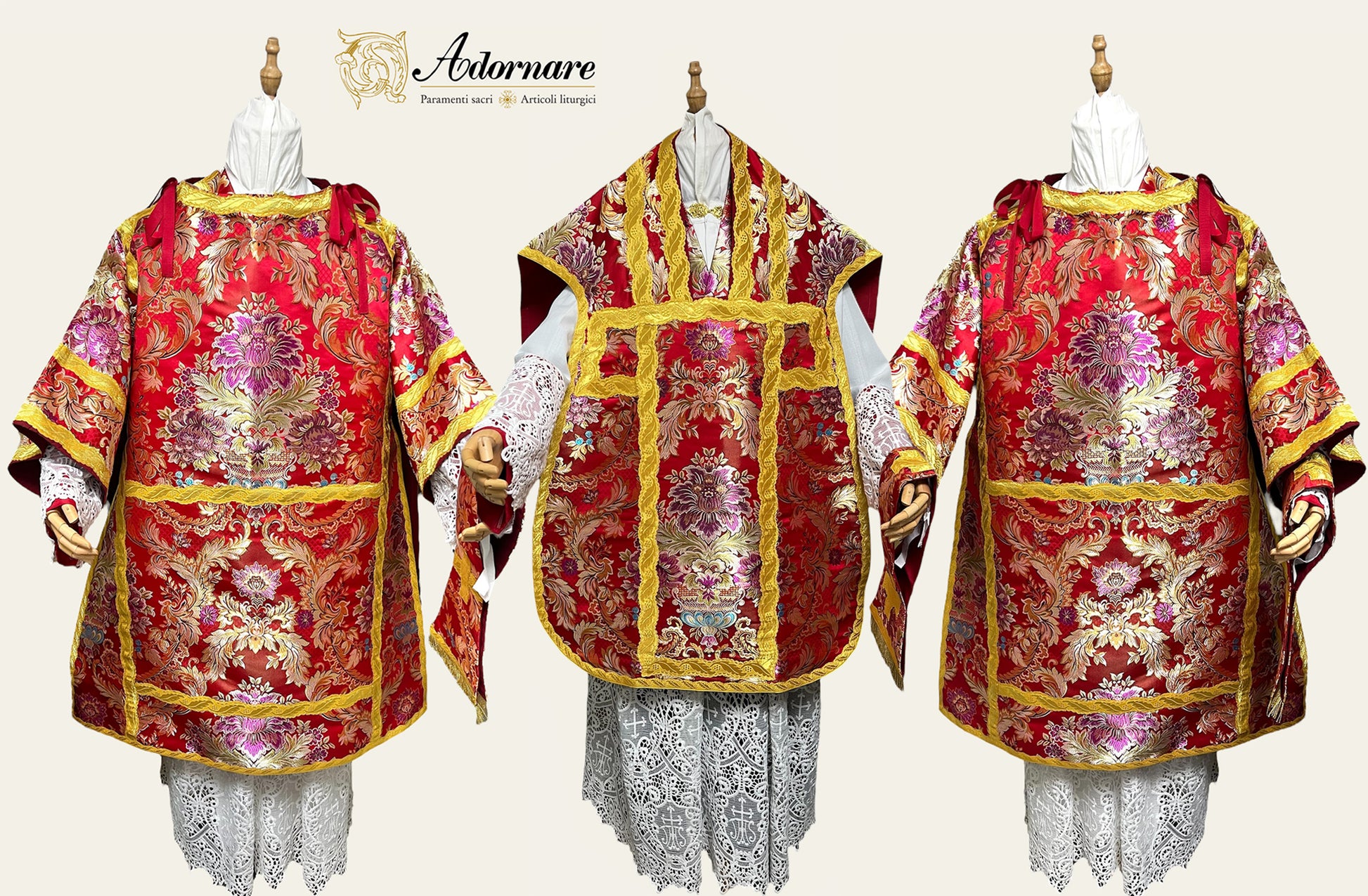 This Italian Solemn Mass Set includes the Italian-cut Roman chasuble and Italian Roman Dalmatics. They are made in Italian floral brocade (75% viscose, 25% silk) and decorated with standard wavy gallons in gold or silver.