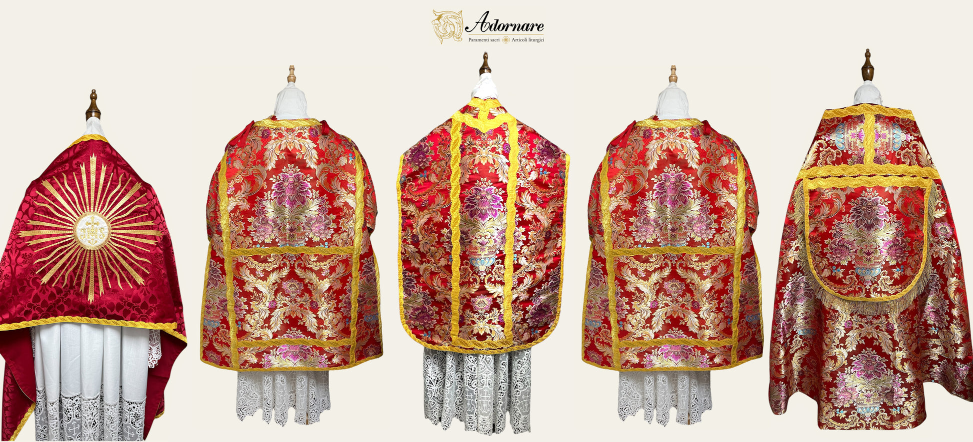 There is also the option to add a brocade humeral veil with sunburst motif in gallons and a matching brocade roman cope.