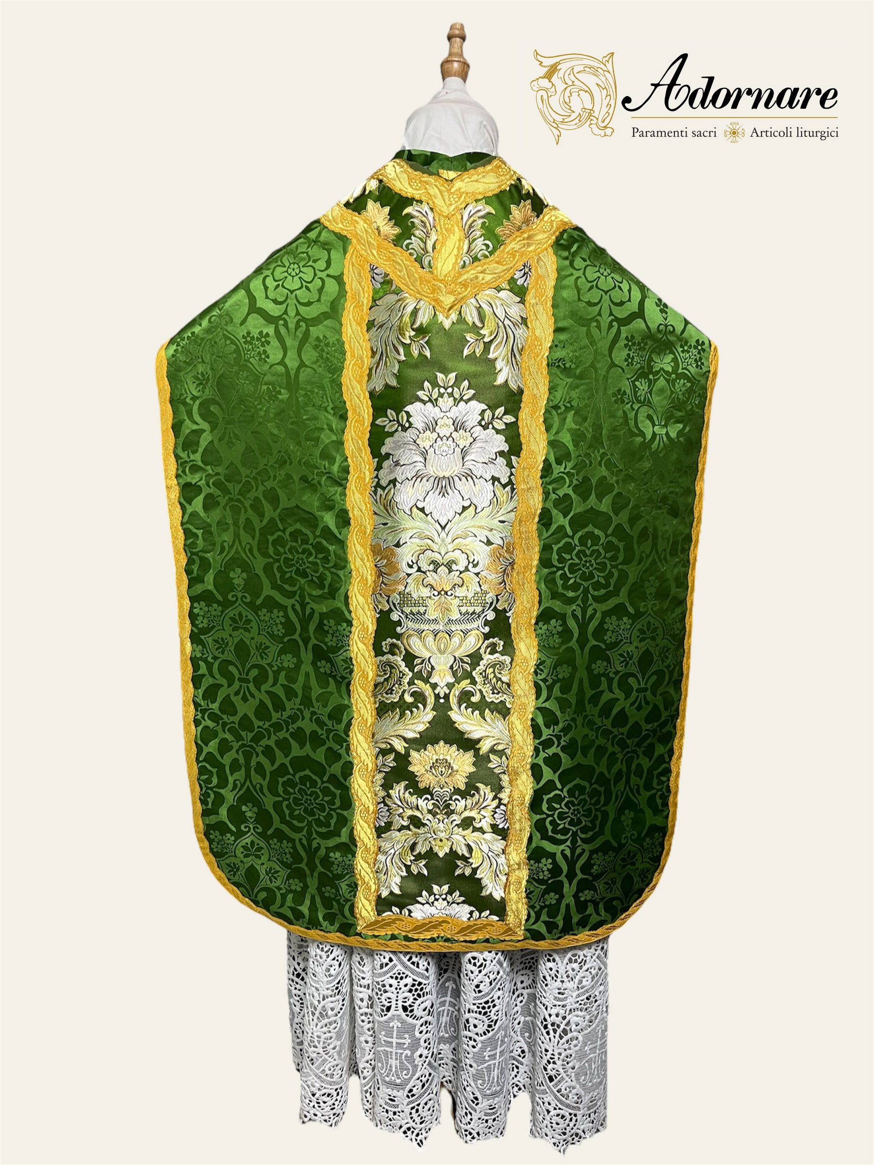 This Italian Solemn Mass Set includes the Italian-cut Roman chasuble and Italian Roman Dalmatics. They are made in Winchester damask (100% viscose) with insert panels of Italian floral brocade (75% viscose, 25% silk) and decorated with standard wavy gallons in gold or silver.