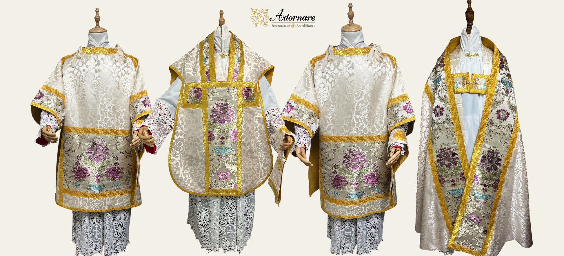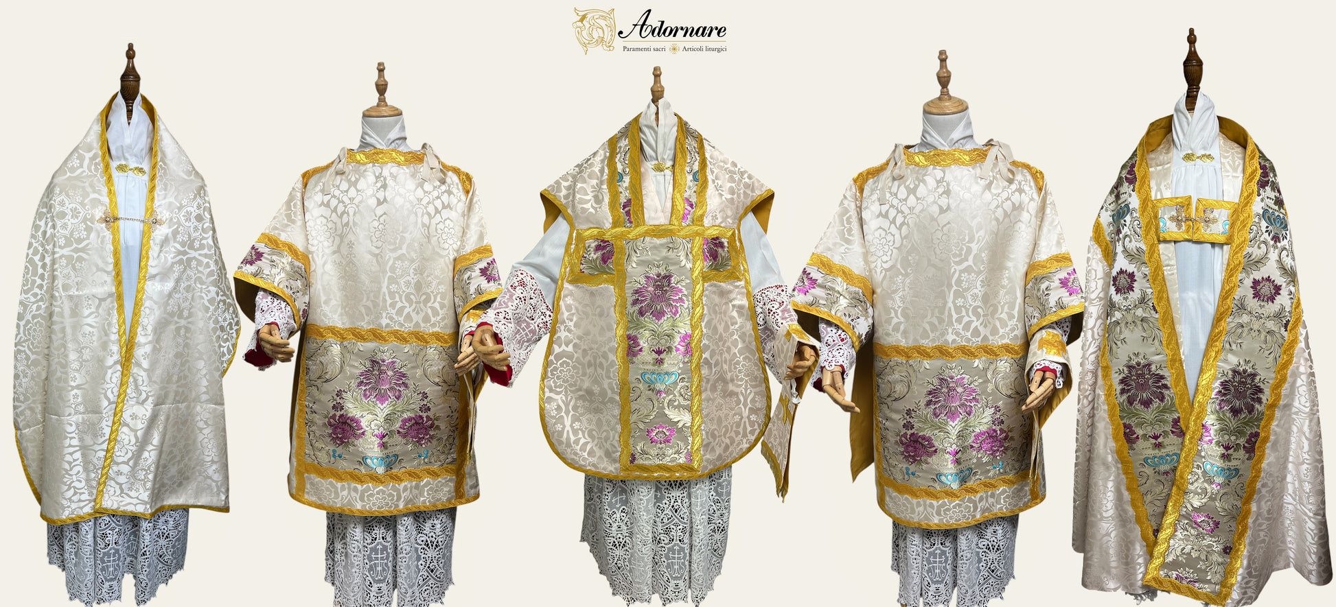 The basic Solemn Mass Set includes: a chasuble, a dalmatic and a tunicle (same design), one priest's stole, two deacon's stoles, three maniples, a chalice veil and a burse.