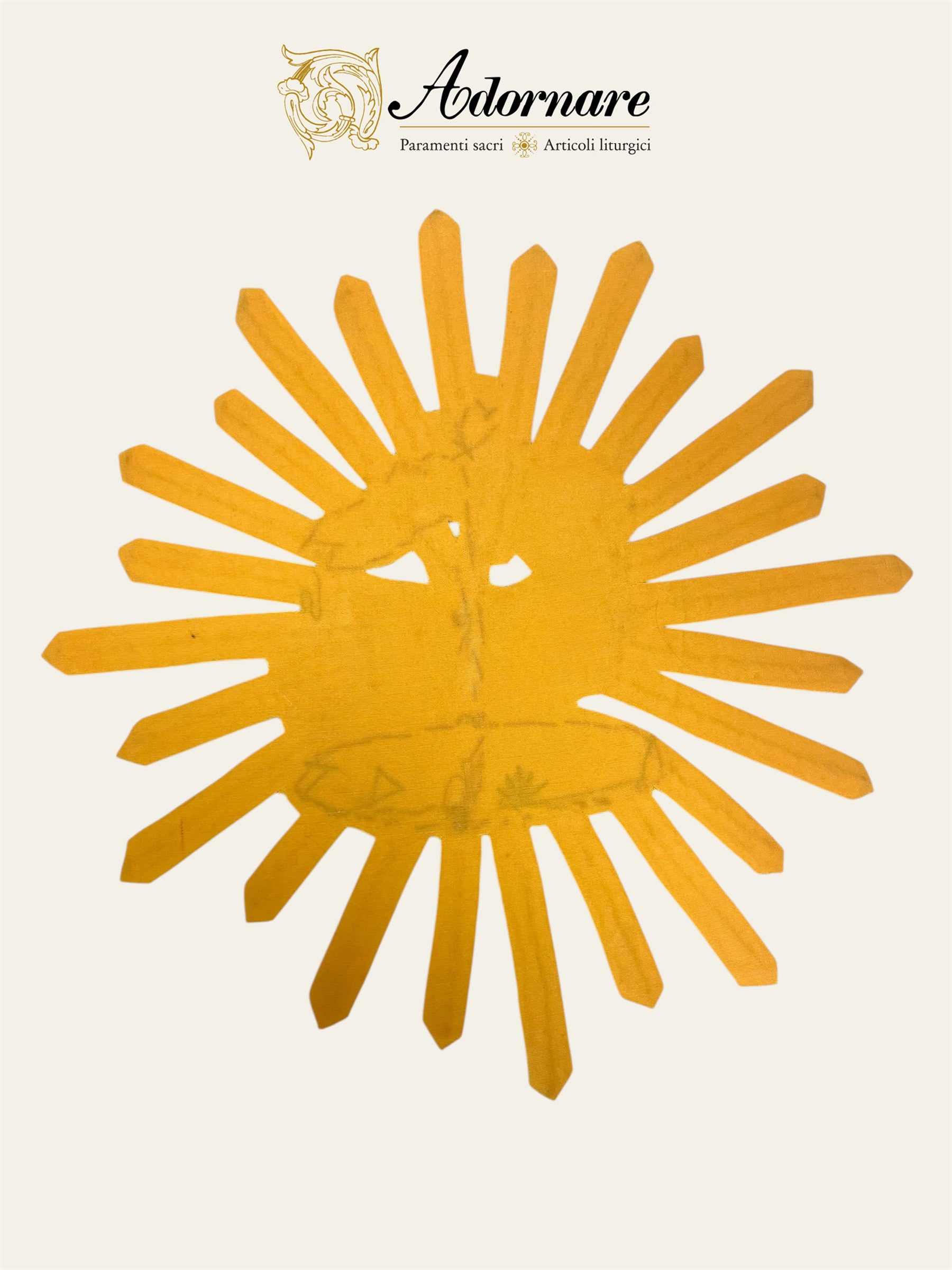 The application is attached on a backing yellow fabric cut around the rays, and can be attached by hand-stitching to vestments and altar textiles.