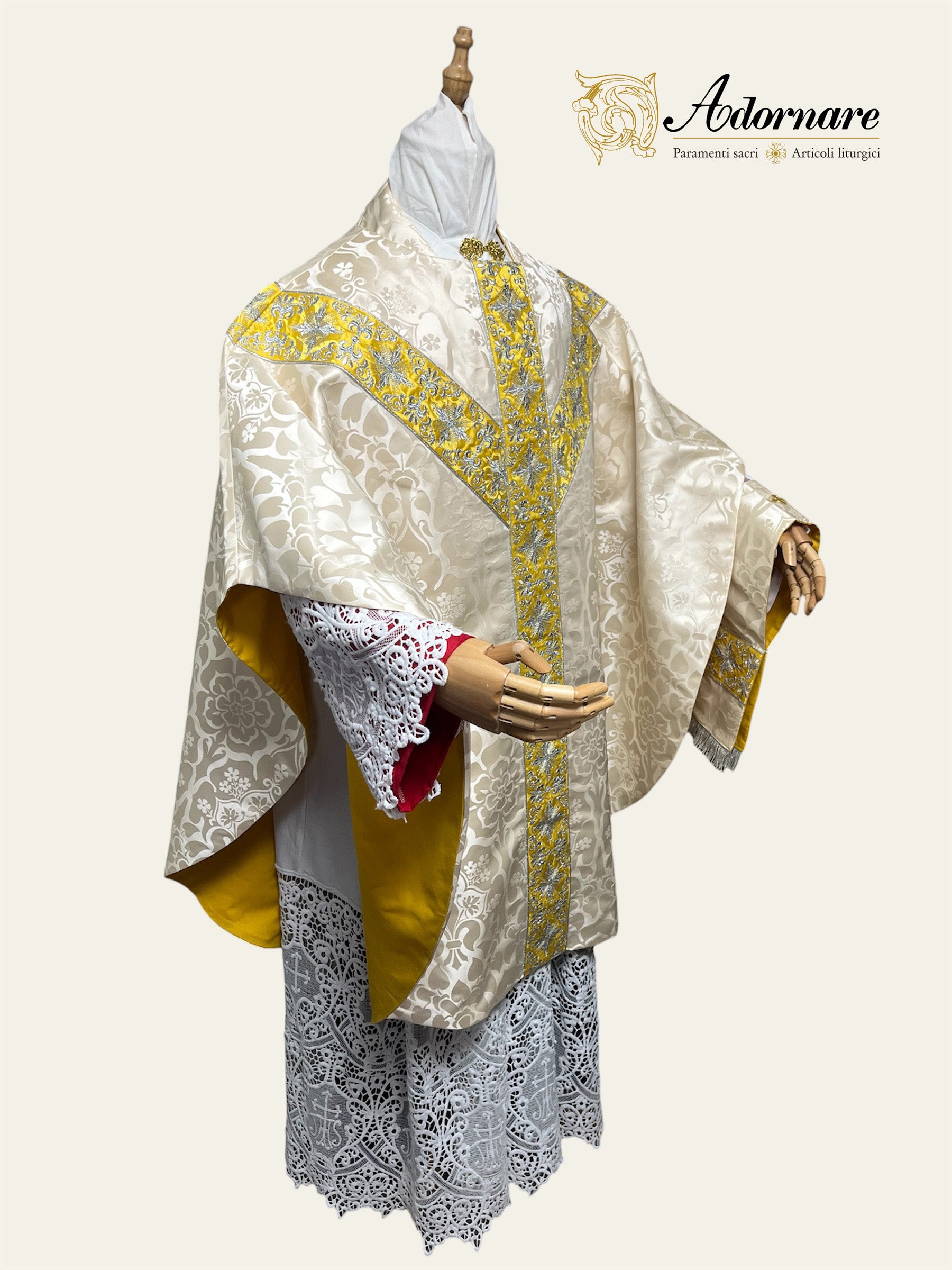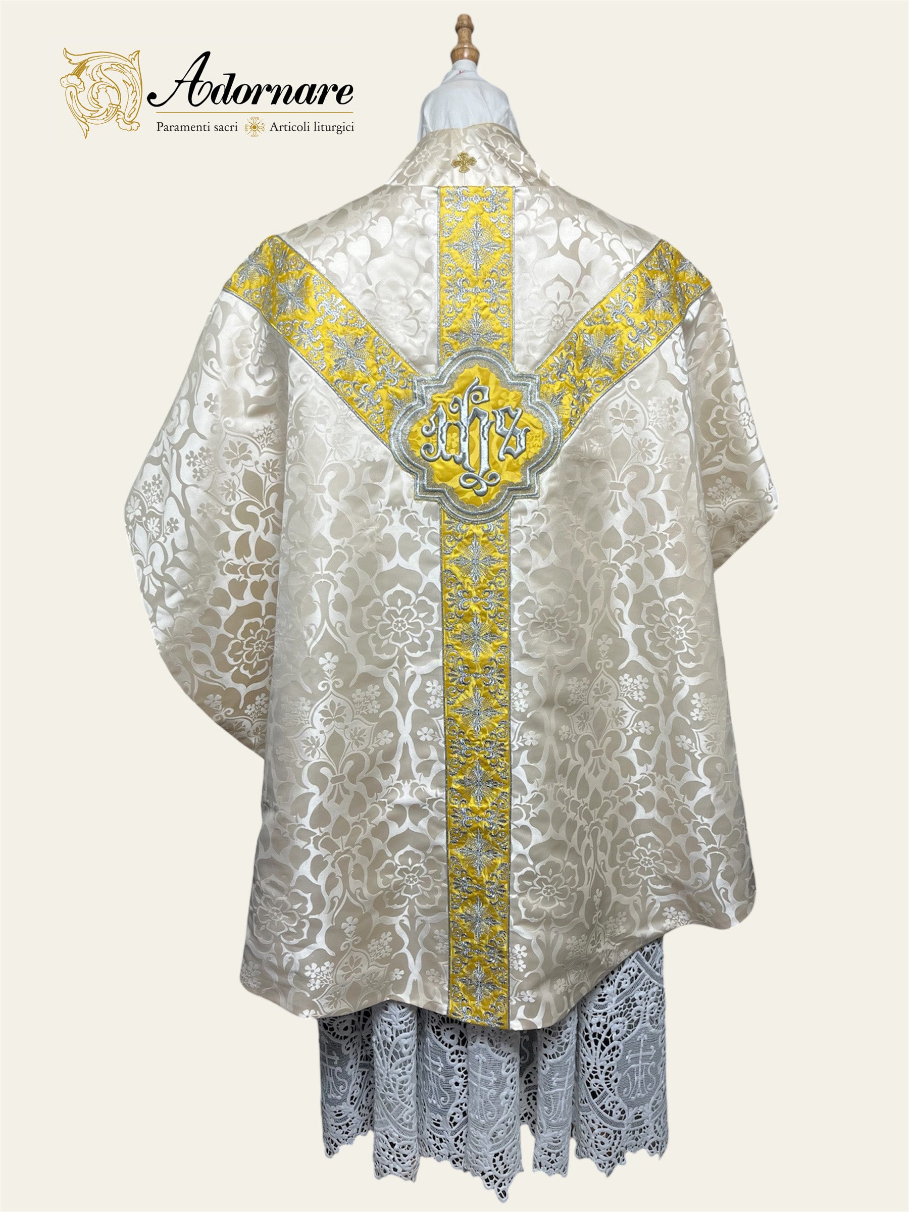 Semi-gothic chasuble with embroidered ornate cross Y-orphrey and IHS appliqué - Low Mass Set / Casula semi-gotica Damasco ricamato a macchina